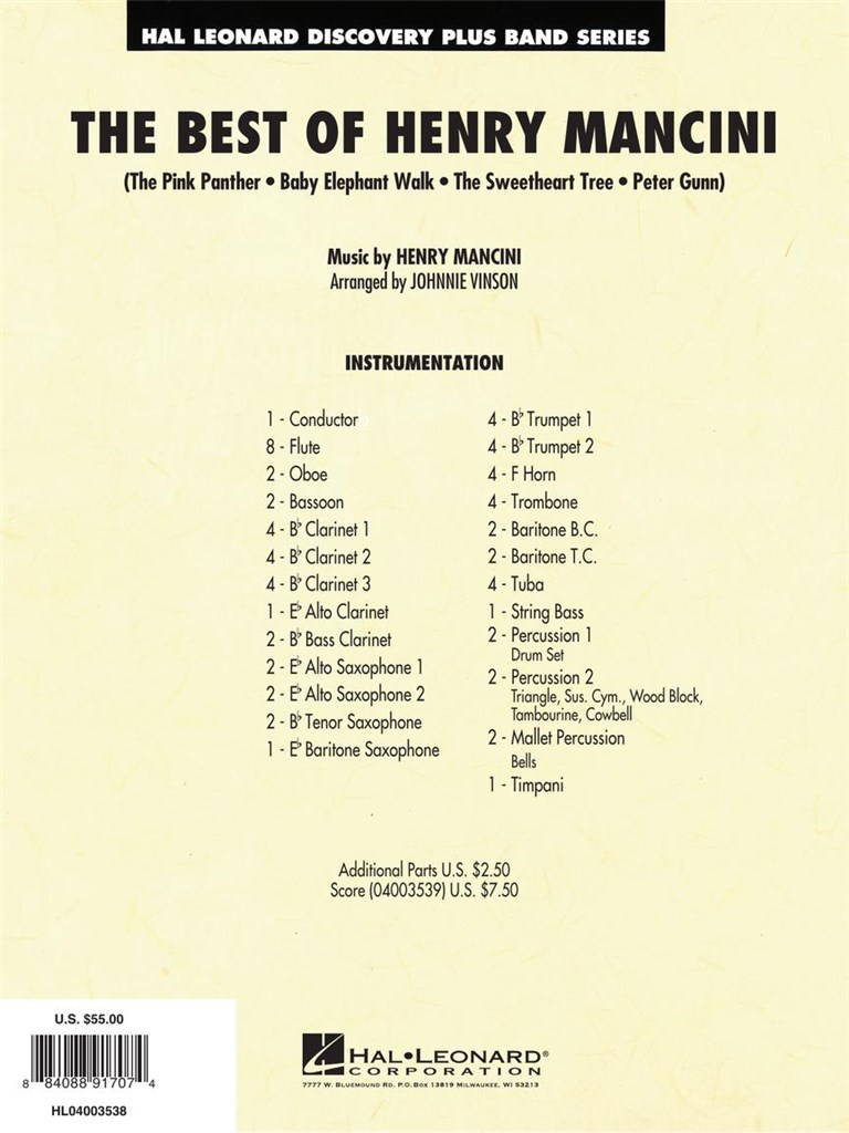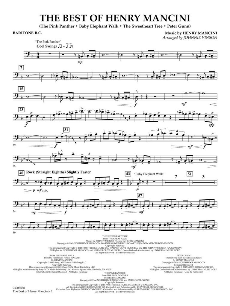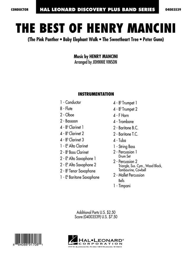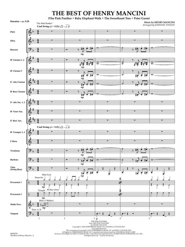 Featuring jazz influenced harmonies and tuneful melodies, the music où Henry Mancini appeals to all generations. This outstanding medley for young players includes the timeless favorites The Pink Panther, Baby Elephant Walk,The Sweethearêtree, and Peter Gunn.
