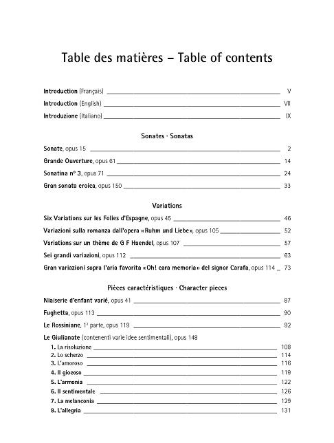 Mauro Giuliani est aujourd’hui considéré comme le guitariste-compositeur le plus important du début du XIXe siècle. Non seulement Giuliani était le plus grand musicien de son époque : sa renommée dépassait largement le domaine des passionnés de guitare, lui valant une place parmi l’élite musicale en tant que musicien complet et polyvalent. Pourtant, à la fin du XIXe siècle, il était en grande partie oublié et sa musique parvint à conserver peu plus qu’une présence marginale dans le répertoire des grands guitaristes du début du XXe siècle. La revitalisation actuelle de son œuvre doit ses origines aux recherches monumentales commencées par Thomas Heck en 1971 et poursuivies par Ruggero Chiesa, Mario Torta, Marco Riboni et Gerhard Pen. Grâce au dévouement de ces érudits, la musique de Giuliani a progressivement retrouvé sa place d’antan dans le répertoire d’exécution. Giuliani écrivit environ 230 œuvres, dont 150 portent des numéros d’œuvre. Ils comprennent avant tout des pièces pour guitare solo et une quantité considérable de musique de chambre pour guitare et violon, flûte, piano ou voix, ainsi que trois concertos pour guitare. D’après les textes des premières éditions publiées, les pièces de cette collection n’ont été révisées qu’avec l’ajout de doigtés (selon la technique documentée dans la méthode de Giuliani (Studio per la chitarra opus 1) et son Esercizio per la chitarra contenente 24 pezzi della maggiore difficoltà, diversi preludi passaggi ed assolo opus 48, publié par Steiner en 1813) et la correction d’erreurs typographiques évidentes.