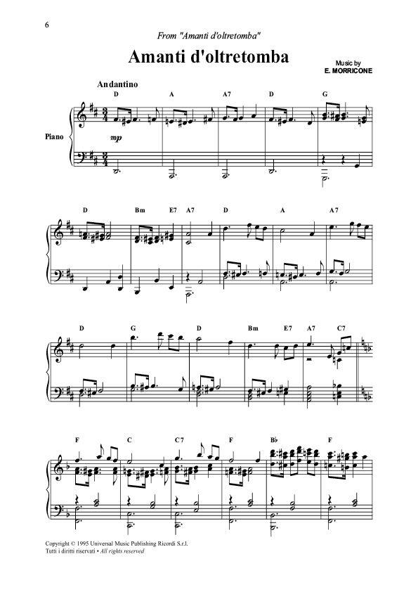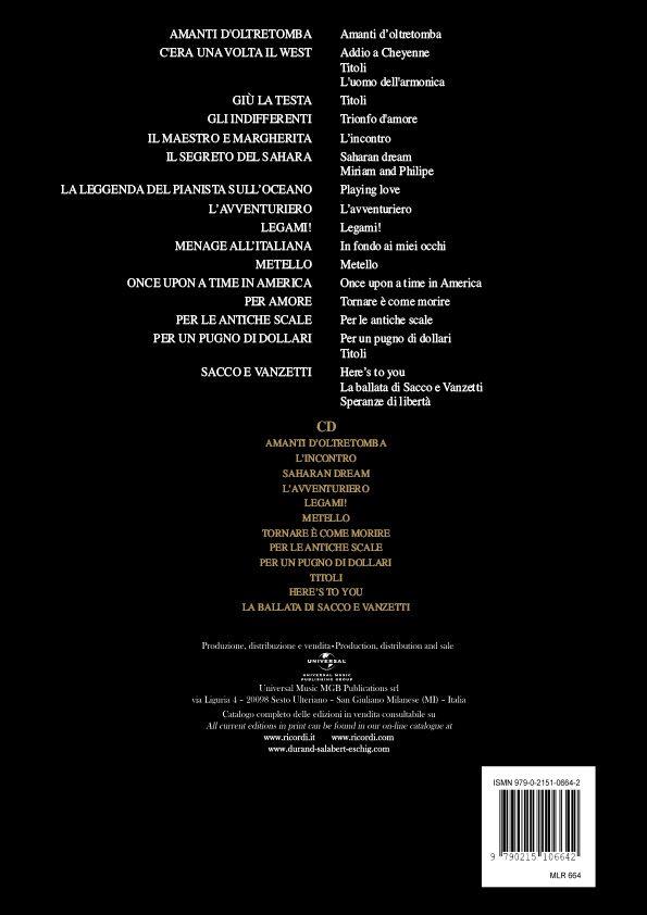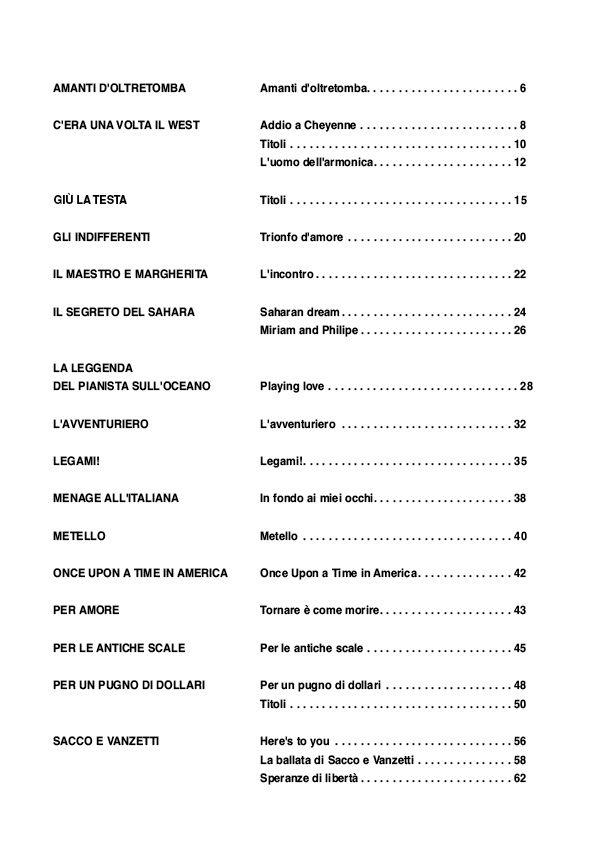 Thèmes des films Les amants d'outre-tombe : Amanti d'oltretomba. Il était une fois dans l'ouest : Addio a Cheyenne - Thème - L'homme à l'harmonica. Les indifférents : Thème - Trionfo d'amore. Le maître et Marguerite : L'incontro. Le secret du Sahara : Sahara Dream - Miriam and Philipe. La légende du pianiste sur l'océan : Playing love. L'Aventurier : L'Avventuriero. Legami : Legami. Ménage à l'italienne : In fondo ai meiei occhi. Metello : Metello. Il était une fois en Amérique : Once upon a time in America. Par amour : Tornare é come morire. Vertige : Per le antiche scale. Pour une poignée de dollards : Per un pugno di dollari - Thème. Sacco et Vanzetti : Here's toyou - La ballata di Sacco e Vanzetti - Sperane di Liberta.