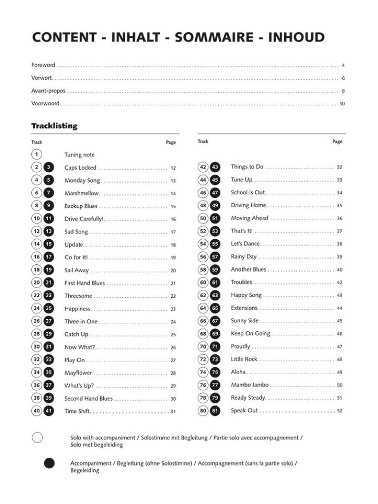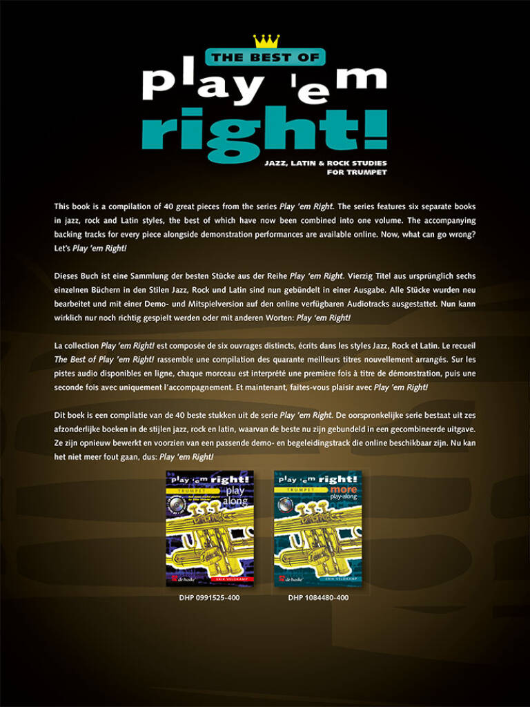 La collection Play‘em Right! est composée de six ouvrages distincts, écrits dans les styles Jazz, Rock et Latin. Le recueil The Best of Play‘em Right! rassemble une compilation des quarante meilleurs titres nouvellement arrangés. Sur les pistes audio disponibles en ligne au format MP3, chaque morceau est interprété une première fois titre de démonstration, puis une seconde fois avec l‘accompagnement uniquement, pour pouvoir jouer « live ». Et maintenant, faites-vous plaisir !