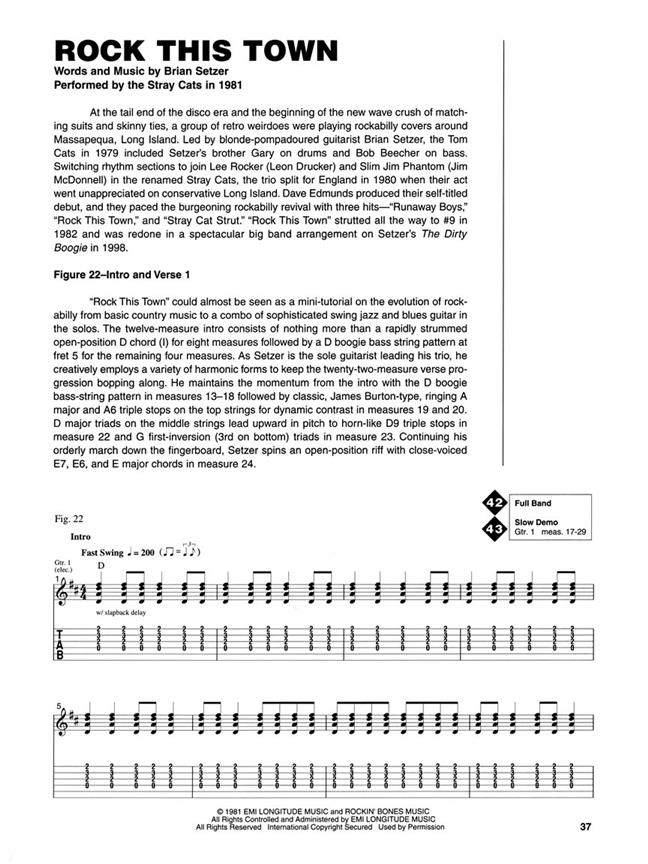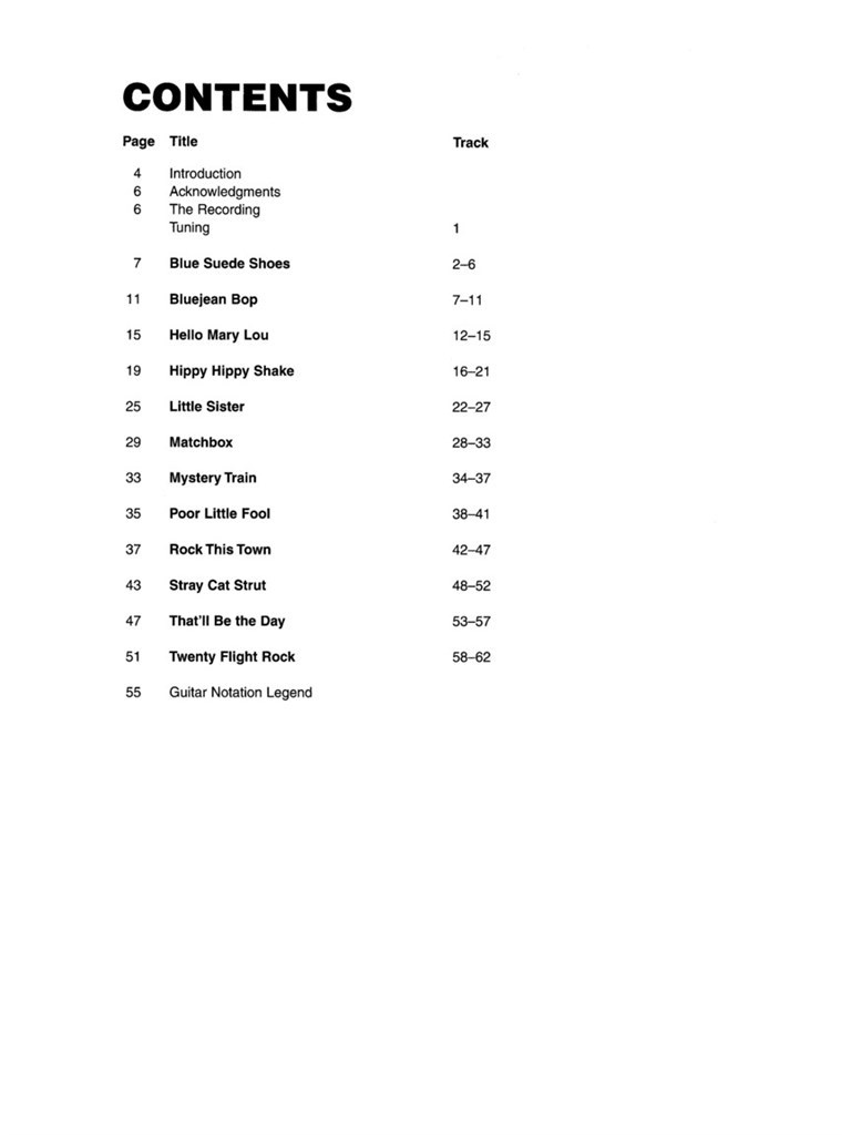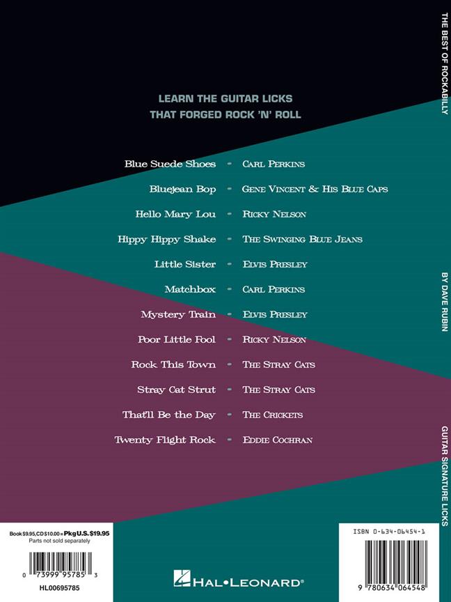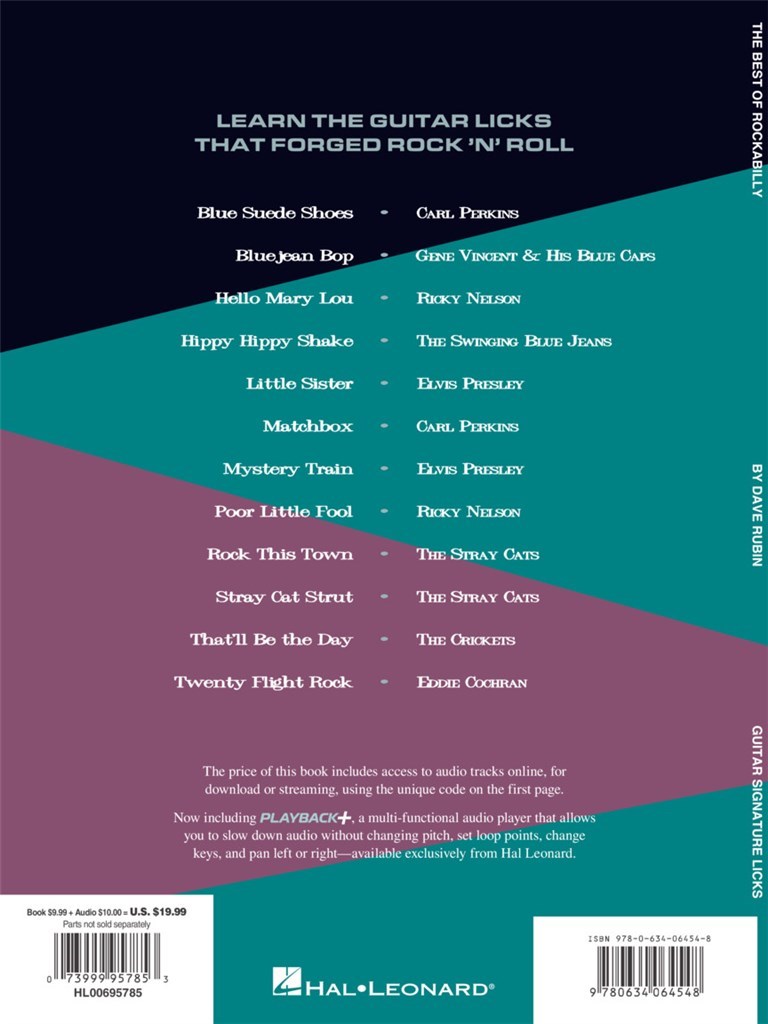 Dave Rubin dissects the best licks from a dozen rockabilly bellringers: Blue Suede Shoes · Bluejean Bop · Hello Mary Lou · Hippy Hippy Shake · Little Sister · Matchbox · Mystery Train · Poor Little Fool · Rock This Town · Stray Cat Strut · That'll Be the Day · Twenty Flight Rock. Learn the guitar licks that forged rock'n'roll! Demonstration audio tracks included for practice purposes. Audio is accessed online using the unique code inside the book and can be streamed or downloaded. The audio files include PLAYBACK+, a multi-functional audio player that allows you to slow down audio without changing pitch, set loop points, change keys, and pan left or right.