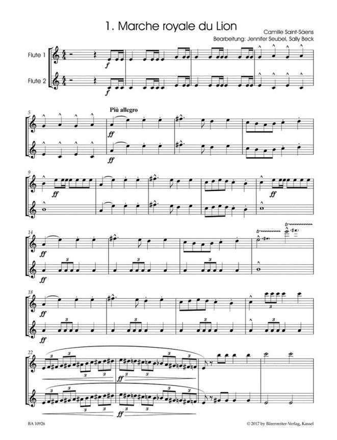 The transformation of the major instruments, timbres and melodies of the orchestral version into solely two flute parts posed a special challenge. The results exploit the full tonal spectrum of the flute. The arrangement offers several alternatives to expand the range of sound: for example, a piccolo can be substituted for either flute part in No. 2 "Poules et coqs" and for the first flute in No. 7 "Aquarium".