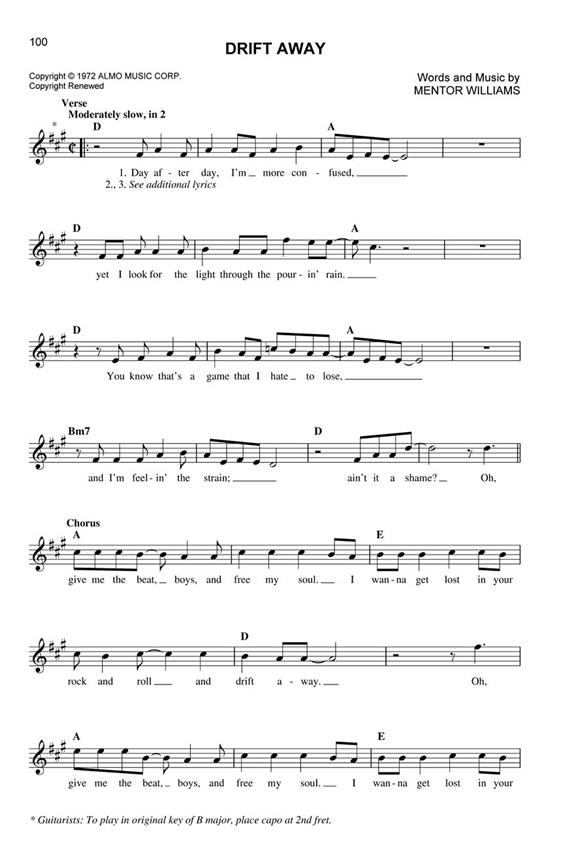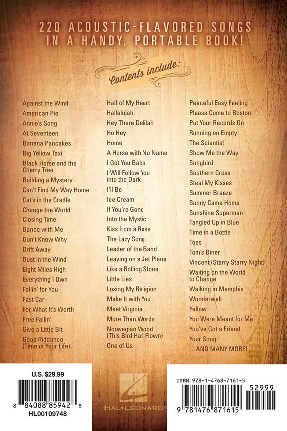 Une sélection de chansons incontournables de la variété et du pop/rock acoustique international en transcriptions ligne mélodique, paroles complètes et accords tous instruments. Titres : Across The Universe - Against The Wind - Alison - American Pie - American Tune - Annie's Song - Arms Of A Woman - At Seventeen - Baby Can I Hold You - Baby Hold On - Babylon - Banana Pancakes - Barely Breathing - Beg Steal Or Borrow - Big Yellow Taxi - Black Horse And The Cherry Tree - The Boys Of Summer - Breakeven - Building A Mystery - Burn One Down - Can't Find My Way Home - Caramel - Cat's In The Cradle - Catch The Wind - Change The World (featured on the Motion Picture Soundtrack PHENOMENON) - Chasing Cars - The Christians And The Pagans - Chuck E's In Love - Cigarettes And Chocolate Milk - City Of New Orleans - Closer To Fine - Closing Time - Come Monday - Come On Get Higher - Come Pick Me Up - Constant Craving - Copperhead Road - Criminal - Dance With Me - Danny's Song - Darlin' Do Not Fear - Diamonds On The Inside - Don't Know Why - Don't Look Back In Anger - Dream Weaver (featured in the Motion Picture WAYNE'S WORLD) - Drift Away - Dust In The Wind - Early Mornin' Rain - Eight Miles High - Elderly Woman Behind The Counter In A Small Town - Escape (The Pina Colada Song) - Everybody's Talkin' (Echoes) (from MIDNIGHT COWBOY) - Everyone's Waiting - Everything I Own - Fallin' For You - Famous Blue Raincoat - Fast Car - Feels Like Home (from the Motion Picture MICHAEL) - Fidelity - Flake - Follow You Down - Fooled Around And Fell In Love - For What It's Worth - Free Fallin' - Fugitive - Give A Little Bit - Good Riddance (Time Of Your Life) - Good Time Charlie's Got The Blues - Half Of My Heart - Hallelujah (featured in the DreamWorks Motion Picture SHREK) - Have A Little Faith In Me - Have You Ever Seen The Rain? - Hello, It's Me - Hey There Delilah - Hickory Wind - Ho Hey - Hold You In My Arms - Home - Home - Hook - A Horse With No Name - Hummingbird - I Believe She's Lying - I Can't Make You Love Me - I Got You Babe - I Melt With You - I Need You - I Saw The Light - I Will Follow You Into The Dark - I Wonder - I'd Rather Be With You - I'll Be - Ice Cream - If I Had A Boat - If It Makes You Happy - If You Could Read My Mind - If You Leave Me Now - If You're Gone - Into The Mystic - It's A Heartache - Jealousy - Jumper - Kiss From A Rose - Knockin' On Heaven's Door - Last Kiss - The Lazy Song - Leader Of The Band - Least Complicated - Leaving On A Jet Plane - Let Him Fly - Like A Rolling Stone - Little Lies - Losing My Religion - Lover, You Should've Come Over - Lowdown - Lucky - Make It With You - Man On The Moon - Me and Julio Down By The Schoolyard - Meet Virginia - Missing You - Mrs. Robinson (from THE GRADUATE) - Mr. Bojangles - More Than Words - My Love - Naked As We Came - Name - New York, New York - 1952 Vincent Black Lightning - No Such Thing - Norwegian Wood (This Bird Has Flown) - Oliver's Army - One Love - One Of Us - Operator (That's Not The Way It Feels) - Peace Train - Peaceful Easy Feeling - Pink Houses - Pink Moon - Please Come To Boston - Possession - Push - Put Your Records On - Reason To Believe - Redemption Song - Rhythm Of Love - Round Here - Running On Empty - San Francisco Bay Blues - Sara Smile - Save Tonight - The Scientist - Scotch And Soda - Screaming Infidelities - She Runs Away - She Talks To Angels - Shelter From The Storm - Shiver Me Timbers - Show Me The Way - 6th Avenue Heartache - Skinny Love - Sky Blue Sky - Slip Slidin' Away - Songbird - The Sound Of Silence - Southern Cross - The Space Between - Stay - Steal Away - Steal My Kisses - Still - Stolen - Stoned Soul Picnic (Picnic, A Green City) - The Story - Suddenly I See - Summer Breeze - Sunny Came Home - Sunshine (Go Away Today) - Sunshine Superman - The Swimming Song - Tangled Up In Blue - Taxi - Tequila Sunrise - Thank You - Time In A Bottle - Toes - Tom's Diner - Torn - Touch Of Grey - Trouble - Tupelo Honey - Use Me - Vincent (Starry Starry Night) - Wagon Wheel - Waiting On The World To Change - Walk On The Wild Side - Walking In Memphis - The Way I Am - We Just Disagree - The Weight - Welcome Back (from the Television Series WELCOME BACK, KOTTER) - What I Am - What I Got - White Flag - Who Will Save Your Soul - Why Walk When You Can Fly - Wicked Game - Wild Horses - Woman - Wonder - Wonderwall - Wooden Ships - Yellow - You Can Sleep While I Drive - You Learn - You Were Meant For Me - You're So Vain - You've Got A Friend - You've Got To Hide Your Love Away - Your Song