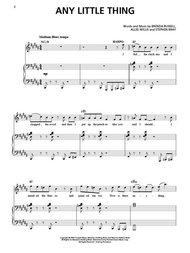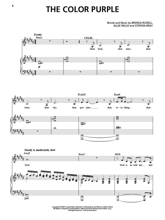 Huit chansons de la reprise de Broadway de 2015 de la comédie musicale, adaptées du roman The Color Purple, présentées en lignes vocales accompagnées de piano. Comprend : N’importe quelle petite chose • La couleur pourpre • Je suis là • Notre prière • Appuyez sur le bouton • Quelqu’un va t’aimer • Trop beau pour être exprimé • Et l’amour ?