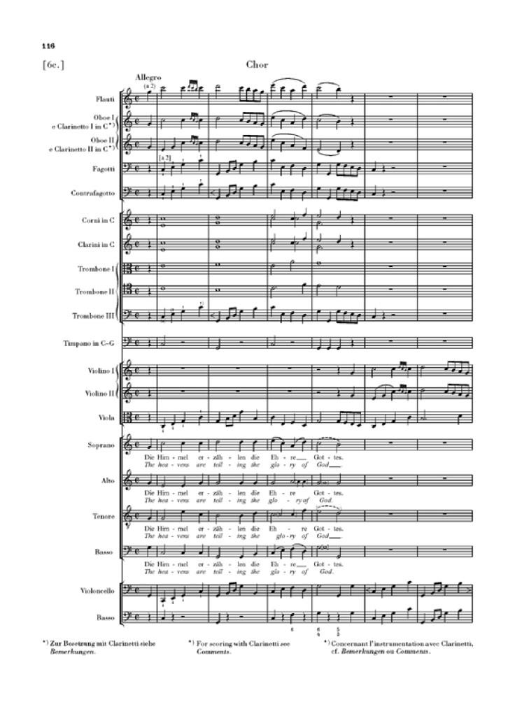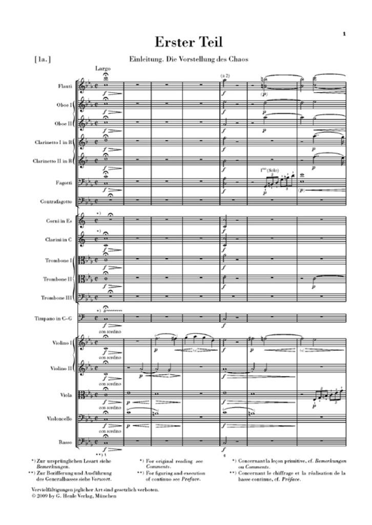 En 1795, Haydn rentre de son deuxième voyage en Angleterre profondément impressionné par les concerts Haendel à grand effectif donnés à l’Abbaye de Westminster. Il a en poche un livret anglais qui doit constituer la «première pierre» de l’une de ses oeuvres les plus célèbres. Le baron van Swieten traduit avec une telle habileté ce livret en allemand que la structure du texte original est maintenue: Haydn peut ainsi publier en 1800 son oeuvre en deux langues . . . ayant ce faisant consciemment en vue le monde musical anglais, qui accueille effectivement avec enthousiasme cette oeuvre colossale sur la création du monde. Le texte de l’édition complète des oeuvres de Haydn(Haydn-Gesamtausgabe) constitue la base de la présente «Studien-Edition» (plus) aisément maniable. ?