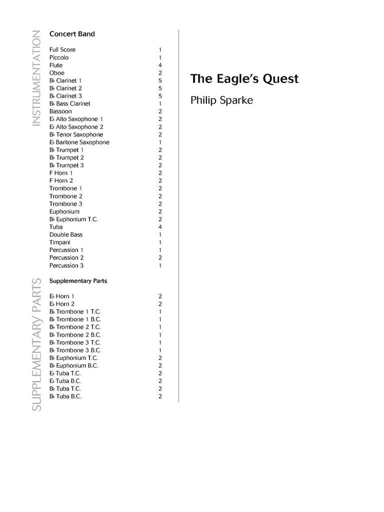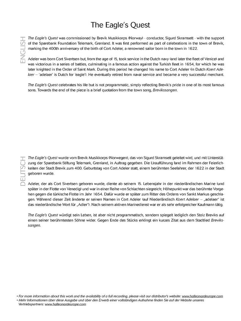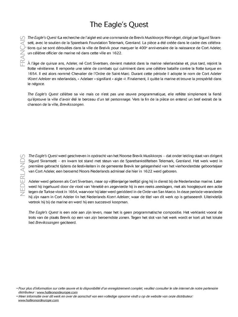 The Eagle's Quest (La recherche de l’aigle) est une commande de Brevik Musikkorps (Norvège) pour marquer le 400e anniversaire de la naissance de Cort Adeler, un célèbre officier de marine norvégien-néerlandais né dans la ville de Breivik en 1622. Son nom néerlandais, Adelaer, signifie « aigle ». Bien que célébrant sa vie, cette pièce n’est pas programmatique, elle reflète simplement la fierté qu’éprouve la ville d’avoir été le berceau d’un tel personnage. Vers la fin de la pièce on entend un bref extrait de la chanson de la ville, Brevikssangen, une conclusion fascinante et appropriée.