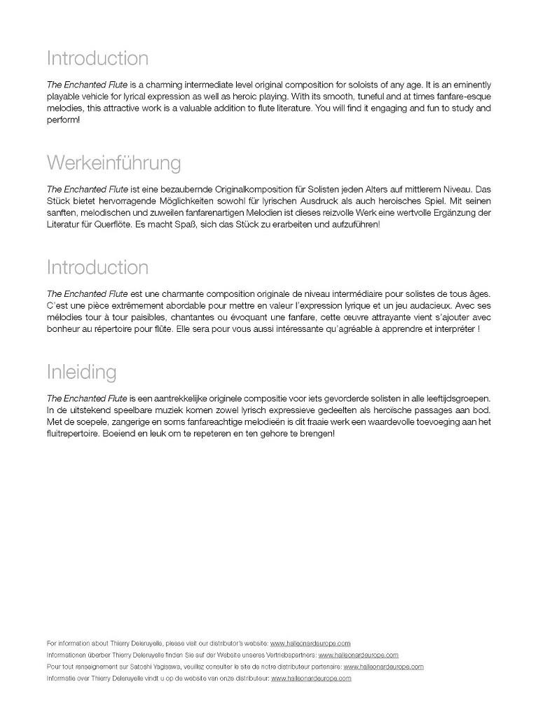 The Enchanted Flute est une charmante composition originale de niveau intermédiaire pour solistes de tous âges. C’est une pièce extrêmement abordable pour mettre en valeur l’expression lyrique et un jeu audacieux. Avec ses mélodies tour à tour paisibles, chantantes ou évoquant une fanfare, cette œuvre attrayante vient s’ajouter avec bonheur au répertoire pour flûte. Elle sera pour vous aussi intéressante qu’agréable à apprendre et interpréter !