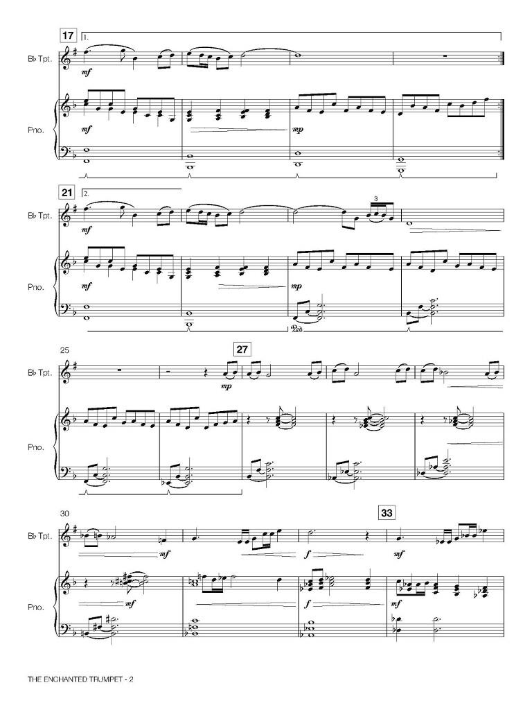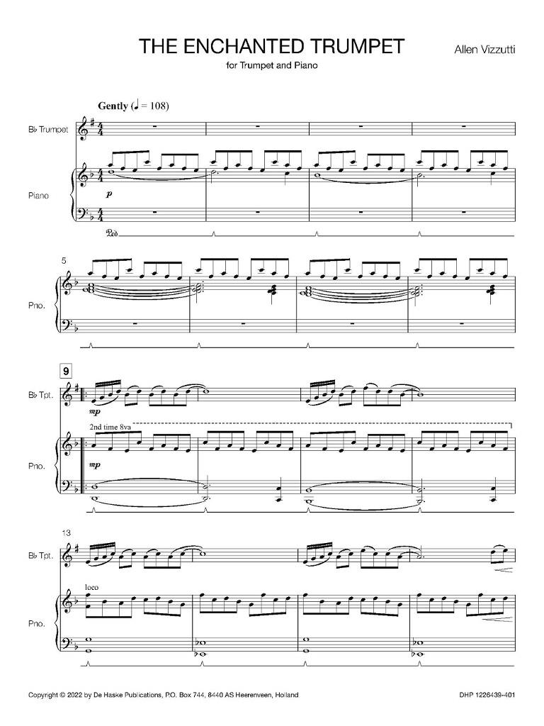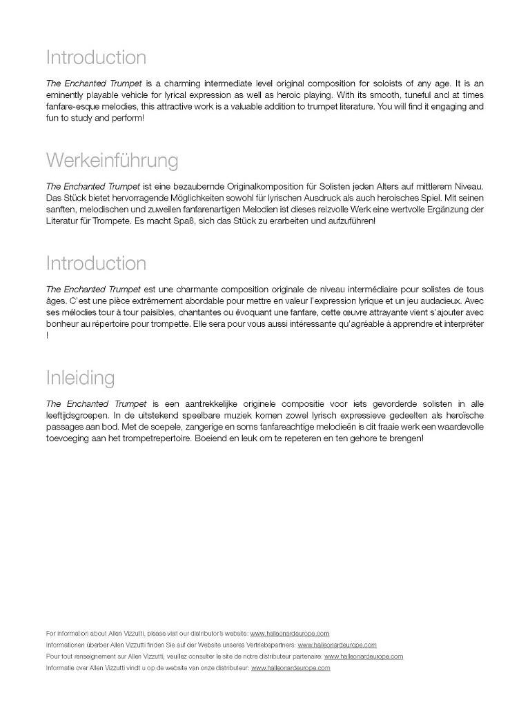 The Enchanted Trumpet est une charmante composition originale de niveau intermédiaire pour solistes de tous âges. C’est une pièce extrêmement abordable pour mettre en valeur l’expression lyrique et un jeu audacieux. Avec ses mélodies tour à tour paisibles, chantantes ou évoquant une fanfare, cette œuvre attrayante vient s’ajouter avec bonheur au répertoire pour trompette. Elle sera pour vous aussi intéressante qu’agréable à apprendre et interpréter !
