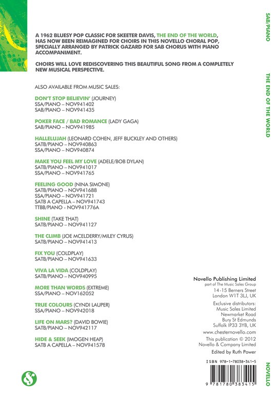 Classique pop bluesy de 1962 pour Skeeter Davis, The End Of The World a désormais été réimaginé pour chœurs dans cette pop chorale Novello, spécialement arrangée par Patrick Gazard pour chœur SAB avec accompagnement au piano. Les chorales adoreront redécouvrir cette magnifique chanson sous un angle musical totalement nouveau.