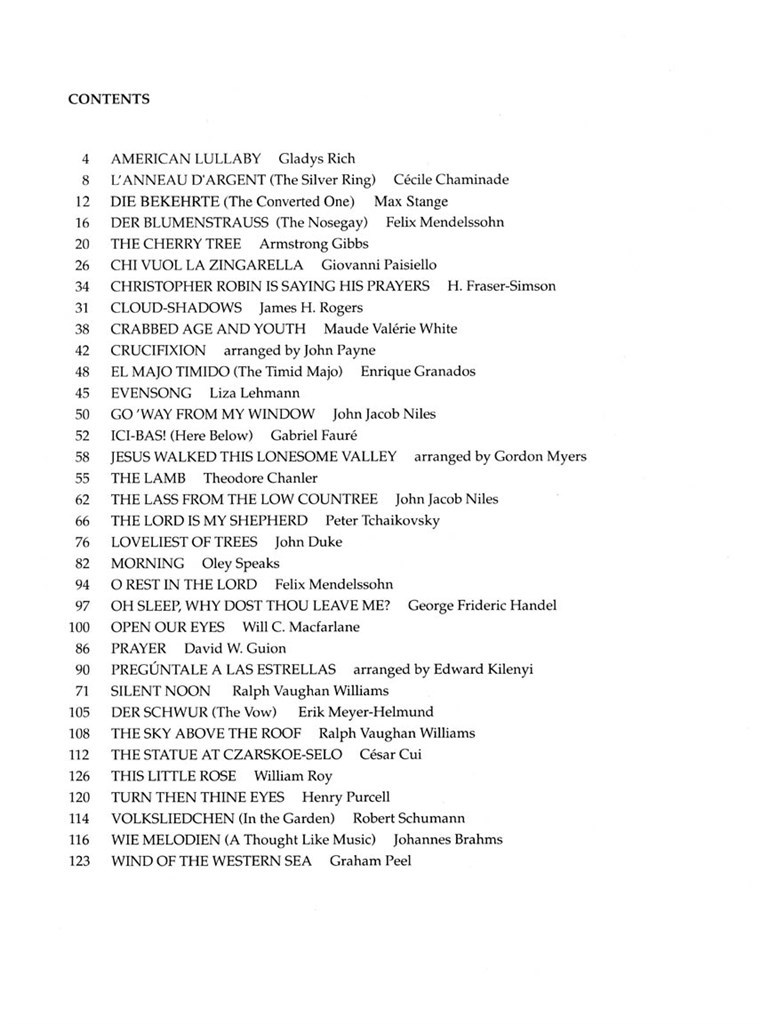 Coffret livre/CD (2 CD). C’est l’un des répertoires pédagogiques les plus utilisés pour les chanteurs aux États-Unis. Plus de 30 chansons dans chaque livre, incluant des chansons d’art américaines et britanniques, des arrangements de chansons folkloriques, des chansons sacrées et un échantillon de chansons de début en allemand, italien, espagnol et français. Il y a une sélection de chansons complètement différente pour chaque type de voix.