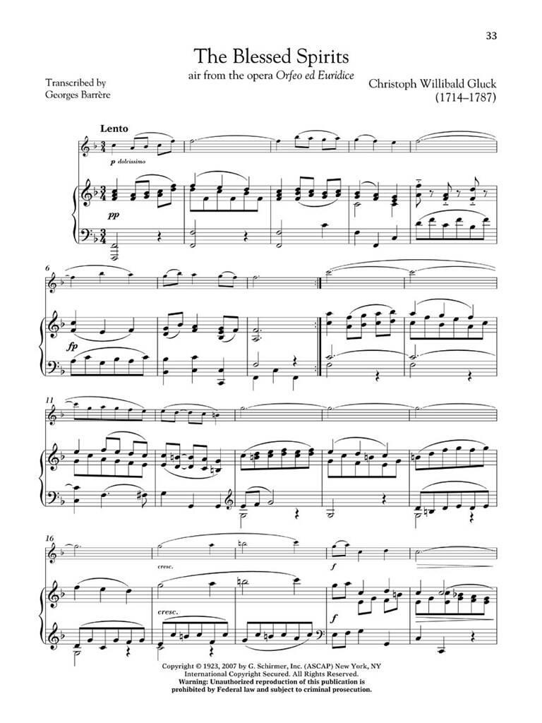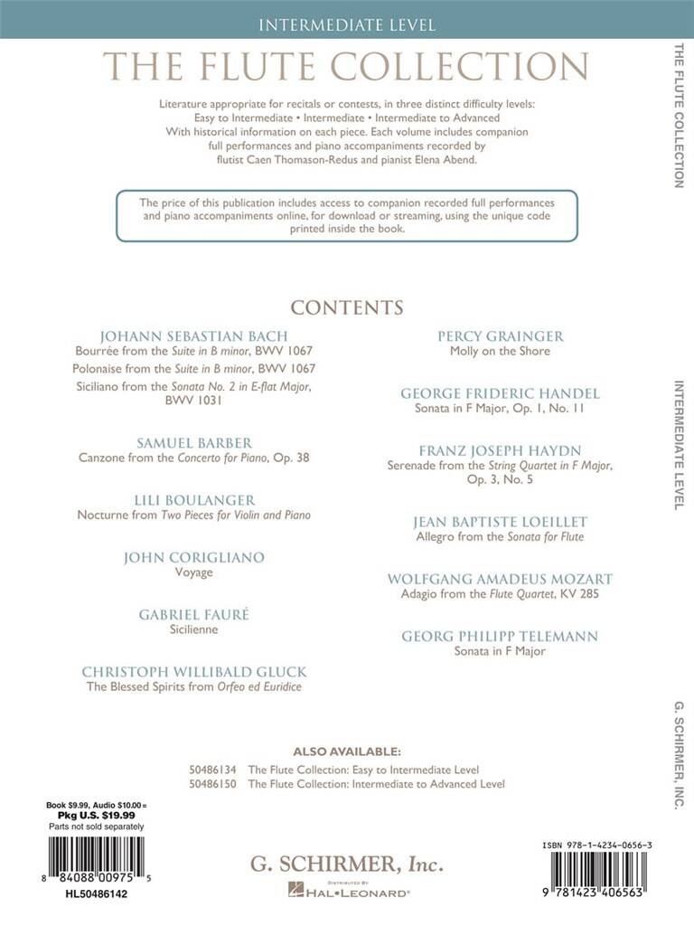 Littérature solo attrayante pour l’élève de niveau intermédiaire. Sommaire : Bourrée de la Suite en si mineur, BWV 1067 (J.S. Bach) • Polonaise de la Suite en si mineur, BWV 1067 (J.S. Bach) • Siciliano de la Sonate n° 2 en mi bémol majeur, BWV 1031 (J.S. Bach) • Canzone du Concerto pour piano, Op. 38 (Barber) • Nocturne de deux pièces pour violon et piano (Boulanger) • Voyage (Corigliano) • Sicilienne (Fauré) • Les Saints Esprits d’Orfeo ed Euridice ( Gluck) • Molly on the Shore (Grainger) • Sonate en fa majeur, op. 1, n° 11 (Haendel) • Sérénade du quatuor à cordes en fa majeur, op.3, n° 5 (Haydn) • Allegro de la Sonate pour flûte (Loeillet) • Adagio du quatuor pour flûte KV 292 (Mozart) • Sonate en fa majeur (Telemann). Le livre inclut un code unique qui vous donne également accès à des pistes d’accompagnement en téléchargement ou en streaming. L’audio en ligne est accessible à halleonard.com/mylibrary. »