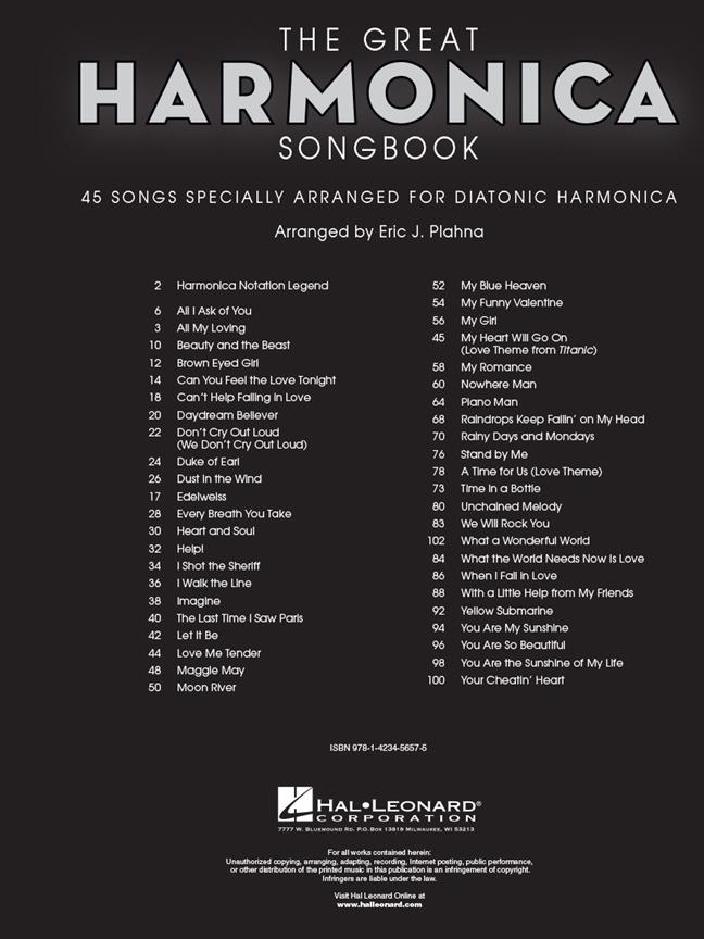 45 morceaux spécialement arrangées pour harmonica diatonique. Le songbook aucun joueur d'harmonica devrait être sans! Dispose de 45 pop, rock, Broadway, les coups de cinéma et des normes