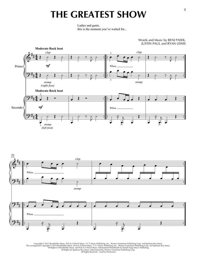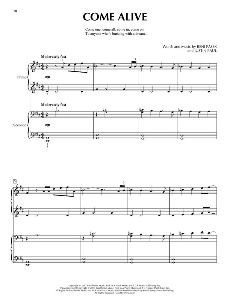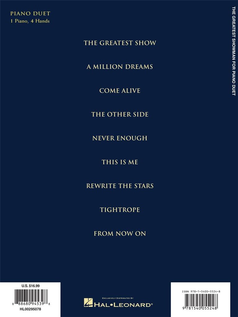 A musical drama biopic chronicling P.T. Barnum (played by Hugh Jackman) and his founding of the Barnum and Bailey Circus, this December 2017 film features a stunning soundtrack by Benj Pasek and Justin Paul of La La Land and Dear Evan Hansen fame. This edition features creative piano duet arrangements for 1 piano, 4 hands. Titles: Come Alive · From Now On · The Greatest Show · A Million Dreams · Never Enough · The Other Side · Rewrite the Stars · This Is Me · Tightrope.