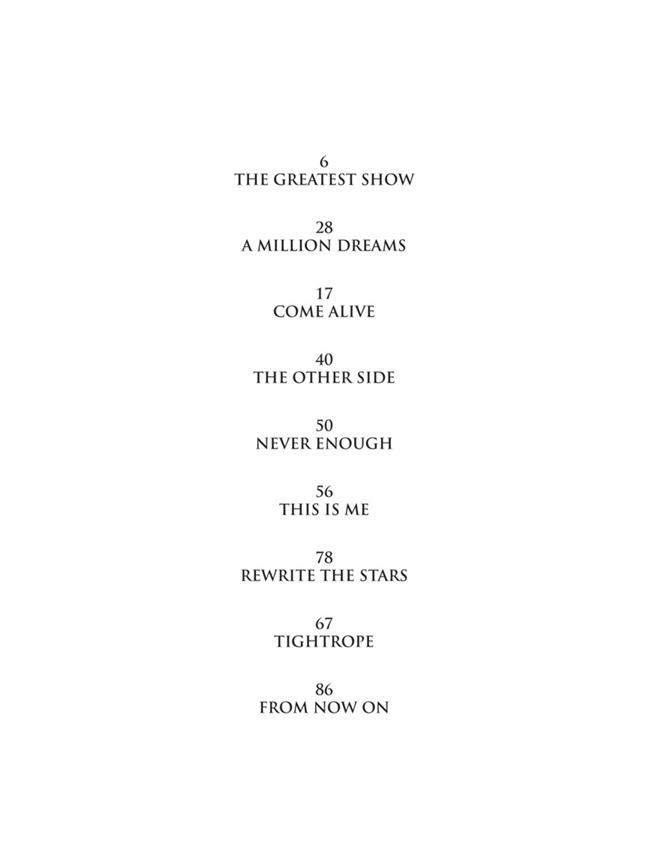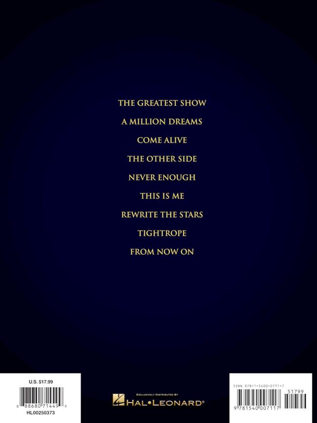 A musical drama biopic chronicling P.T. Barnum (played by Hugh Jackman) and his founding of the Barnum and Bailey Circus, this December 2017 film features a stunning soundtrack by Benj Pasek and Justin Paul of La La Land and Dear Evan Hansen fame. Our songbook features piano/vocal/guitar arrangements of 9 songs including the Golden Globe-winning This Is Me and: Come Alive - From Now On - The Greatest Show - A Million Dreams - Never Enough - The Other Side - Rewrite the Stars - Tightrope. Also includes full-color scenes from the movie.
