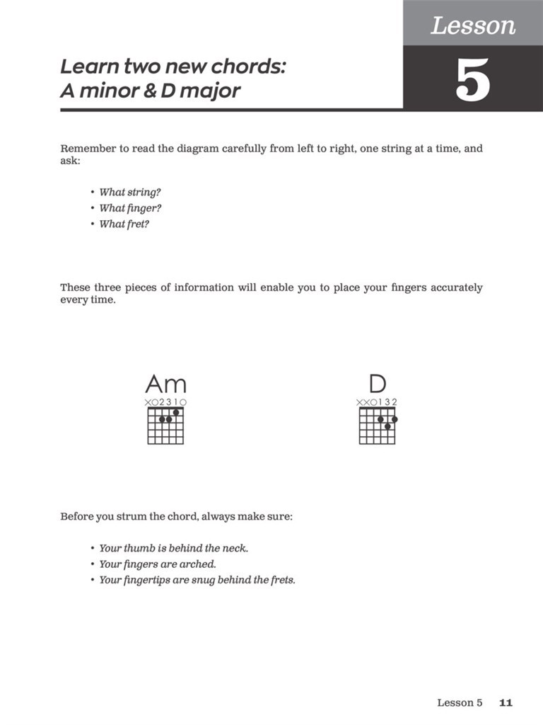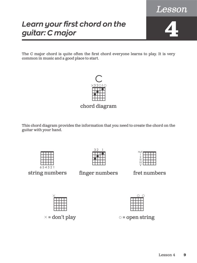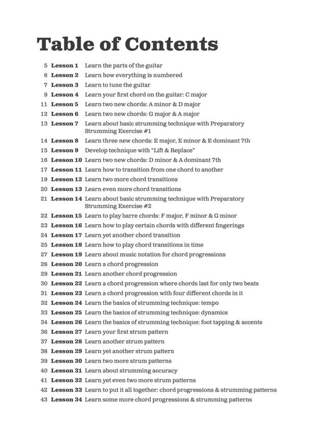 This comprehensive book and video instruction course includes 99 lessons to show you how to play guitar! 14 hours of professional video instruction helps you focus on one concept at a time so you'll be making music after only a few lessons. The course is excellent for complete beginners, as well as experienced players who want to fill in the missing skills they need to take their playing to the next level! Bonus lessons and etudes with demonstration videos and play-along audio tracks are included, as well as video lessons that address goal setting, effective minset, time management and more. Every musical example is written out in tab notation, with fretboard and chord diagrams.