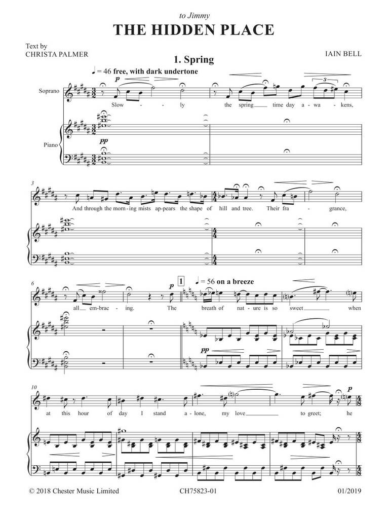 The vocal score for The Hidden Place, a work for solo soprano and orchestra, written for Diana Damrau. The work sets to music a collection of poems that depict the intimate moments shared by two lovers throughout the four seasons. First performed in 2019 by Diana Damrau and the London Symphony Orchestra, conducted by Gianandrea Noseda. Duration: c.15 minutes.