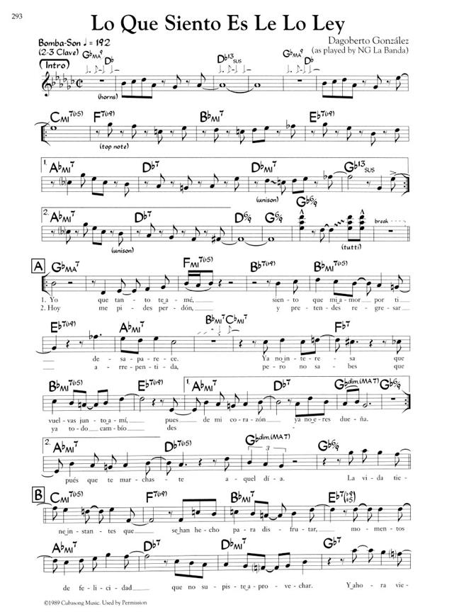 C’est le seul faux livre latin de niveau professionnel jamais publié ! Il comprend près de 600 pages du meilleur de la salsa contemporaine et classique, du jazz latin et de la musique brésilienne, avec des arrangements détaillés, exactement tels qu’enregistrés, pour aider les groupes à jouer dans des styles latins authentiques. De nombreux morceaux incluent des lignes de basse pour chaque section, des montunos pour piano et des contre-lignes de cuivres. Comprend une préface bilingue, des paroles de chansons en espagnol, portugais et/ou anglais, un appendice tambour-percussion, ainsi qu’une reliure en spirale pratique. Parmi les artistes remarquables représentés figurent : Ray Barretto, Eddie Palmieri, Ruben Blades, Puerto Rico All-Stars, Tito Puente, Irakere, Los Van Van, Ivan Lins, Tom Jobim, João Bosco, Milton Nascimento, Airto, Mario Bauza, Dizzy Gillespie, Daniel Ponce, Seis Del Solar, Chick Corea, Arsenio Rodriguez, Celia Cruz, Perez Prado, Orquesta Sensacion, et bien d’autres encore !