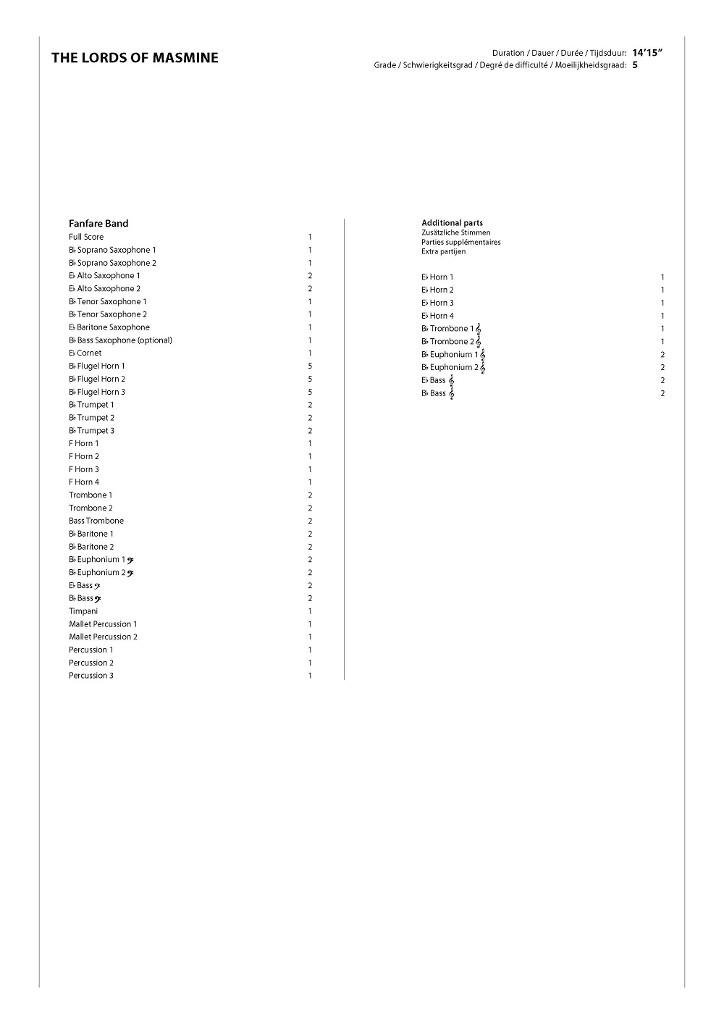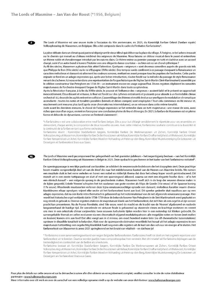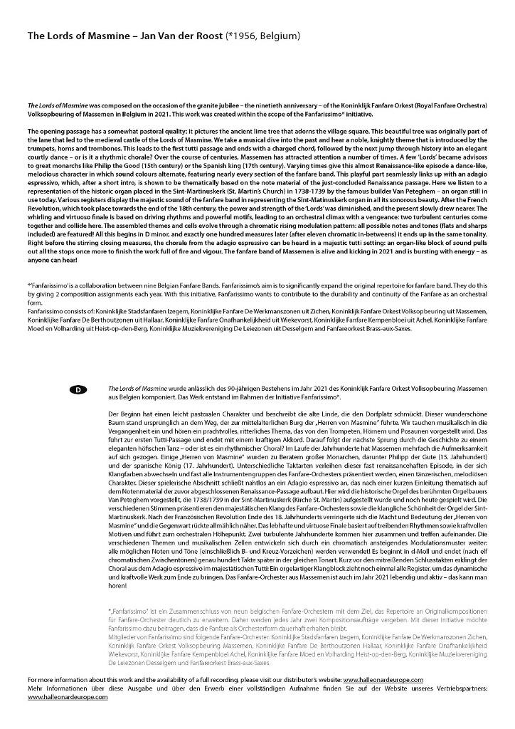 The Lords of Masmine est une œuvre écrite à l’occasion du 90e anniversaire, en 2021, du Koninklijk Fanfare Orkest (Fanfare royale) Volksopbeuring de Massemen, en Belgique. La pièce évoque plusieurs épisodes de l’histoire de Massemen – avec les seigneurs de Masmine comme guides – dans une illustration musicale attrayante et variée qui exploite au maximum les dimensions de la fanfare. Chacun des pupitres joue un rôle important et le public restera captivé d’un bout à l’autre de la pièce !
