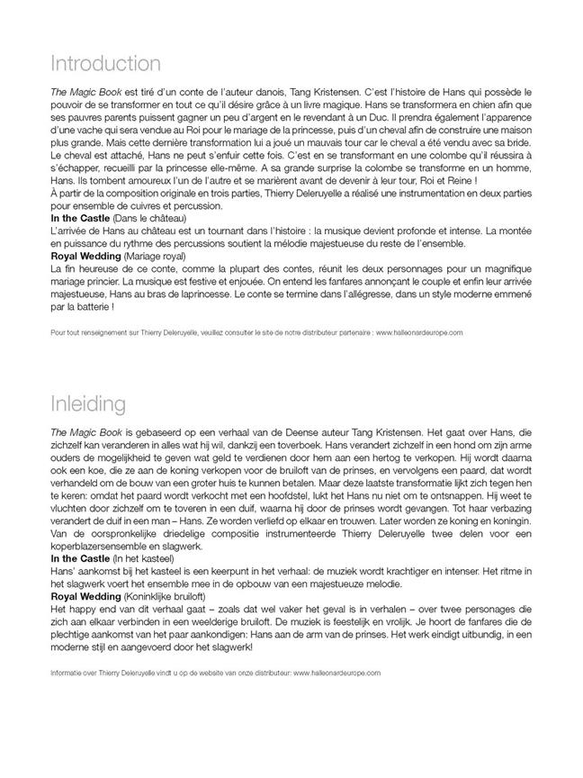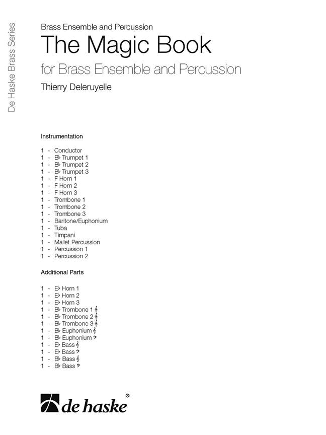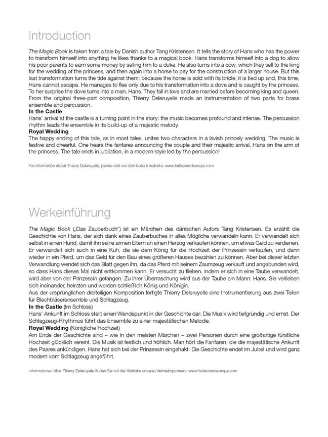 The Magic Book est tiré d’un conte de l’auteur danois, Tang Kristensen. C’est l’histoire de Hans qui possède le pouvoir de se transformer en tout ce qu’il désire grâce à un livre magique. Hans se transformera en chien afin que ses pauvres parents puissent gagner un peu d’argent en le revendant à un Duc. Il prendra également l’apparence d’une vache qui sera vendue au Roi pour le mariage de la princesse, puis d’un cheval afin de construire une maison plus grande. Mais cette dernière transformation lui a joué un mauvais tour car le cheval a été vendu avec sa bride. Le cheval est attaché, Hans ne peut s’enfuir cette fois. C’est en se transformant en une colombe qu’il réussira à s’échapper, recueilli par la princesse elle-même. A sa grande surprise la colombe se transforme en un homme, Hans. Ils tombent amoureux l’un de l’autre et se marièrent avant de devenir à leur tour, Roi et Reine ! À partir de la composition originale en trois parties, Thierry Deleruyelle a réalisé une instrumentation en deux parties pour ensemble de cuivres et percussion. In the Castle (Dans le château) L’arrivée de Hans au château est un tournant dans l’histoire : la musique devient profonde et intense. La montée en puissance du rythme des percussions soutient la mélodie majestueuse du reste de l’ensemble. Royal Wedding (Mariage royal) La fin heureuse de ce conte, comme la plupart des contes, réunit les deux personnages pour un magnifique mariage princier. La musique est festive et enjouée. On entend les fanfares annonçant le couple et enfin leur arrivée majestueuse, Hans au bras de laprincesse. Le conte se termine dans l’allégresse, dans un style moderne emmené par la batterie !