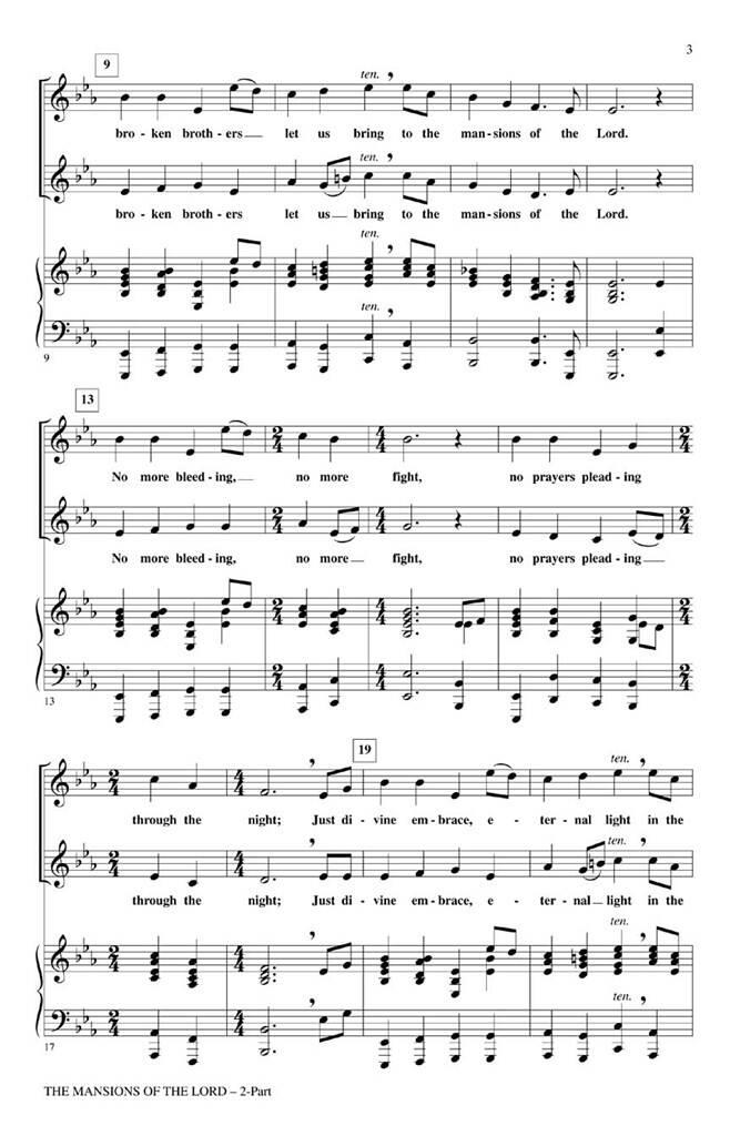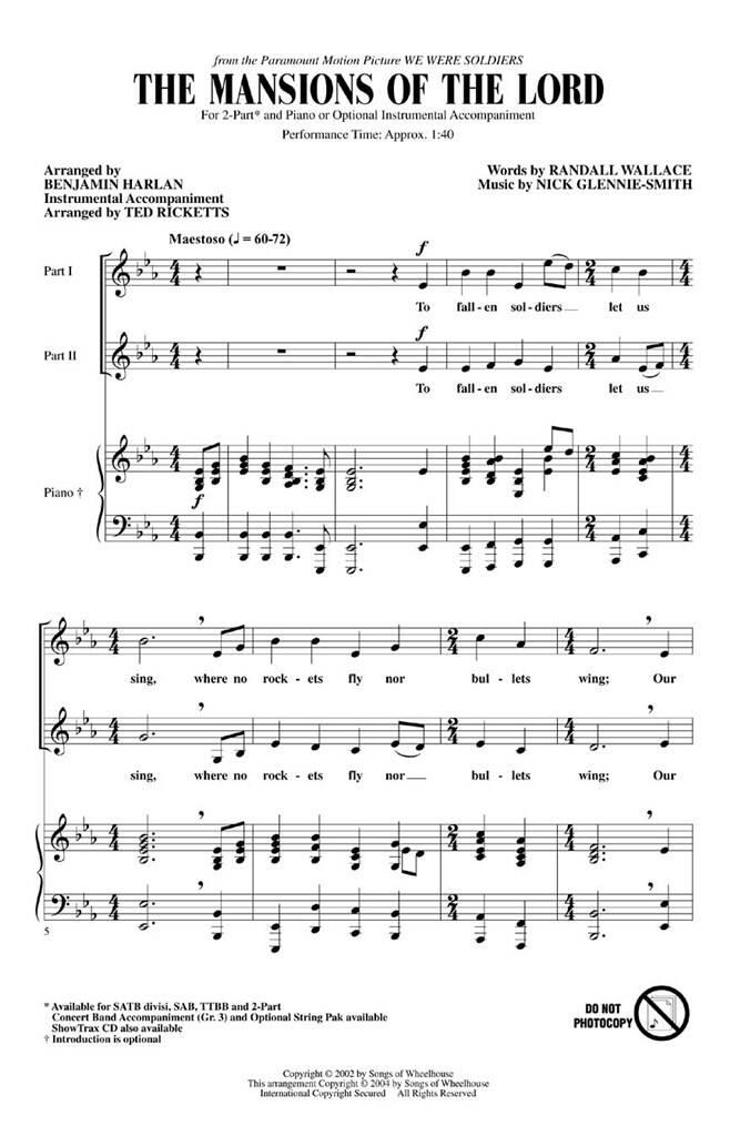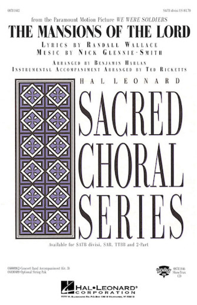 Initialement sur la bande originale du film We Were Soldiers et jouée aux funérailles de Ronald Reagan, cet hommage émouvant aux membres des forces armées est à nouveau pertinent. Aux soldats tombés, chantons, Là où aucune roquette ne vole ni ne s’envole, Nos frères brisés nous apportent Aux Demeures du Seigneur Disponibles séparément : SATB divisi, SAB, 2-Part et TTBB. Accompagnement de concert band (3e année), String Pak optionnel et CD ShowTrax également disponibles. Durée de la représentation : environ 1h40