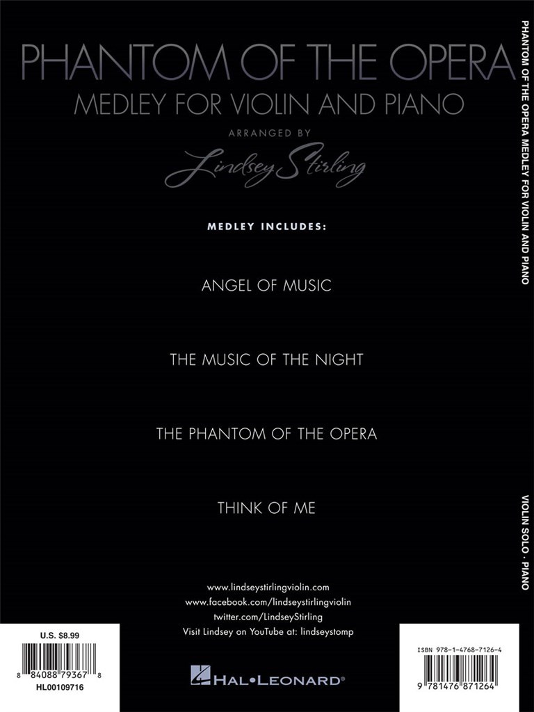 The Phantom Of The Opera Medley pour violon et piano a été arrangé par Lindsey Stirling, qui est devenu célèbre après son apparition sur Got Talent de l'Amérique pour son jeu unique et génial violon.