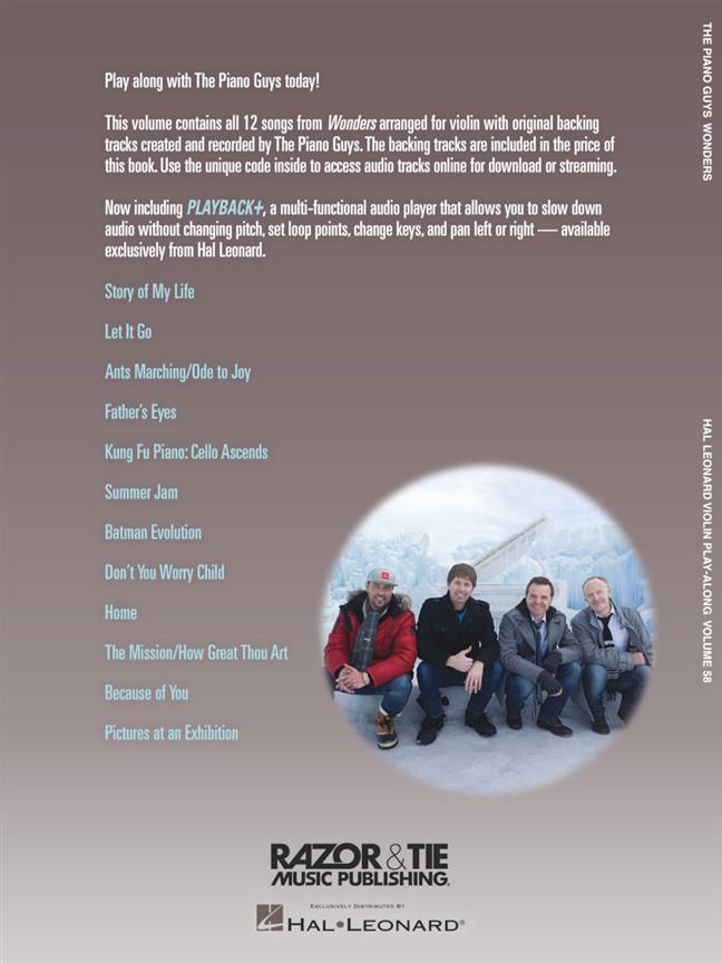 La série Violin Play-Along vous aidera à jouer vos chansons préférées rapidement et facilement. Ce volume spécial vous permet de jouer en même temps que les pistes originales créées et enregistrées par The Piano Guys. Les fichiers sont accessibles en ligne et peuvent être téléchargés ou diffusés en streaming. Le lecteur audio en ligne, Playback+, vous permet de ralentir l’audio sans changer de hauteur, de régler des points de boucle, de changer les tonalités, de planifier à gauche ou à droite, et plus encore ! Ce volume propose 12 sélections issues de la sortie de 2014 du groupe : Ants Marching/Ode to Joy · Évolution de Batman · À cause de toi · Ne t’inquiète pas, enfant · Les Yeux du Père · Accueil · À quel point tu es grand/La Mission · Piano Kung-Fu : Violoncelle S’Élève · Laisse-le aller · Photos à unExposition · L’histoire de ma vie · Summer Jam.