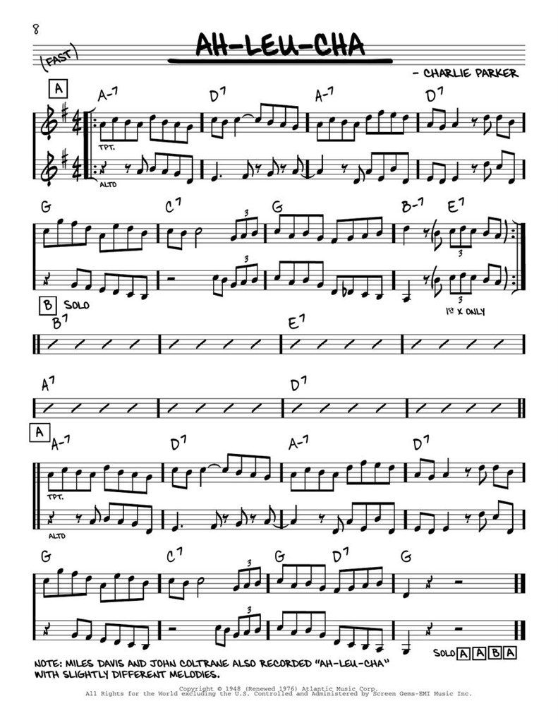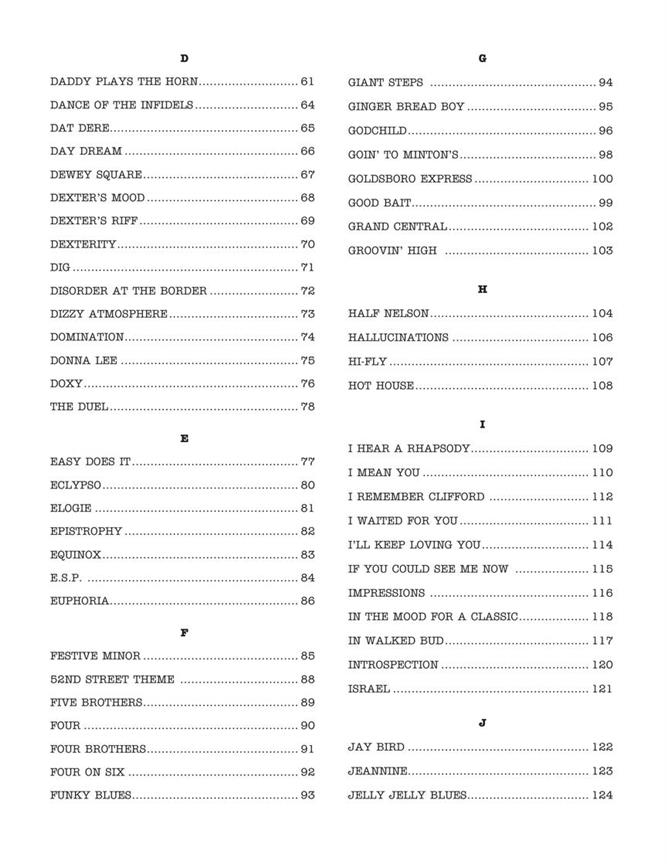 Your new official bebop bible! Over 200 classics arranged for Bb instruments in Real Book style. Titles include: Anthropology · Au Privave · Be-Bop · Boneology · Boplicity (Be Bop Lives) · Byrd Like · Cherokee (Indian Love Song) · Confirmation · Donna Lee · Doxy · Epistrophy · 52nd Street Theme · Four · Goin' to Minton's · Good Bait · Groovin' High · Hi-Fly · Hot House · In Walked Bud · Jay Bird · Lady Bird · Lennie's Pennies · Moose the Mooche · Move · Oblivion · Oleo · Parisian Thoroughfare · Rosetta · Salt Peanuts · Solar · Teaneck · Tin Tin Deo · Tour De Force · Tricrotism · Wail · Woodyn' You · Yardbird Suite · and more!