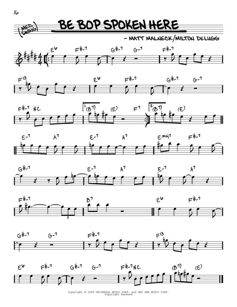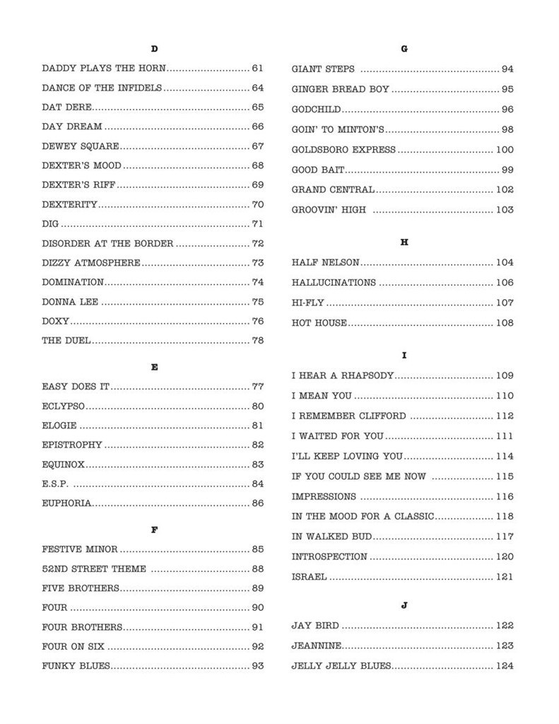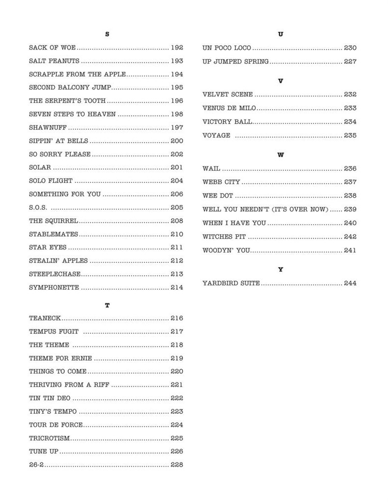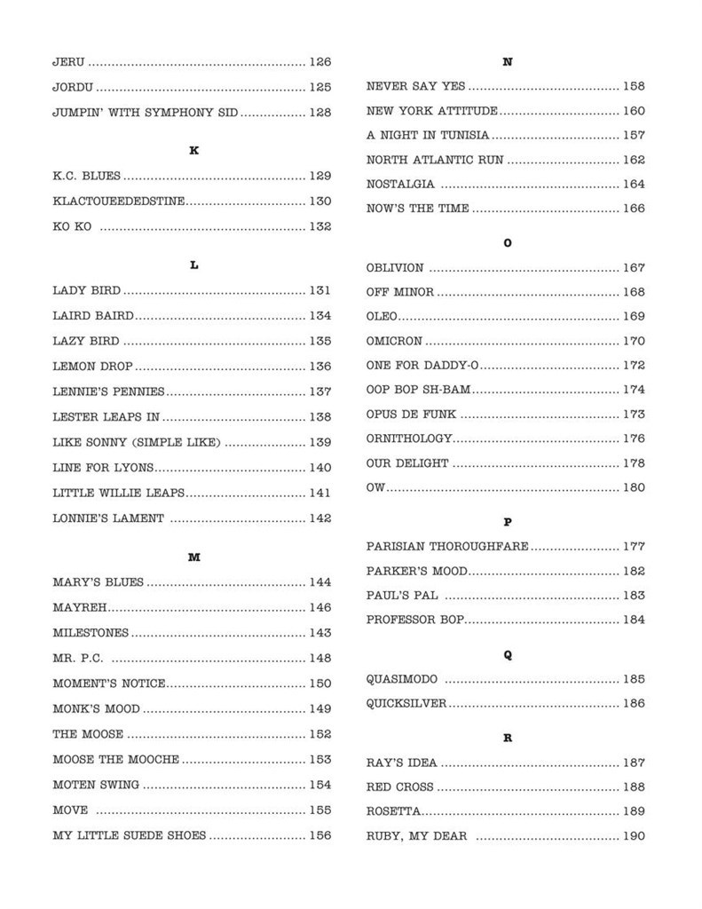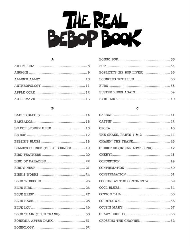 Your new official bebop bible! Over 200 classics arranged for Eb instruments in Real Book style. Titles include: Anthropology · Au Privave · Be-Bop · Boneology · Boplicity (Be Bop Lives) · Byrd Like · Cherokee (Indian Love Song) · Confirmation · Donna Lee · Doxy · Epistrophy · 52nd Street Theme · Four · Goin' to Minton's · Good Bait · Groovin' High · Hi-Fly · Hot House · In Walked Bud · Jay Bird · Lady Bird · Lennie's Pennies · Moose the Mooche · Move · Oblivion · Oleo · Parisian Thoroughfare · Rosetta · Salt Peanuts · Solar · Teaneck · Tin Tin Deo · Tour De Force · Tricrotism · Wail · Woodyn' You · Yardbird Suite · and more! Comb bound.