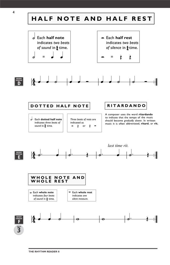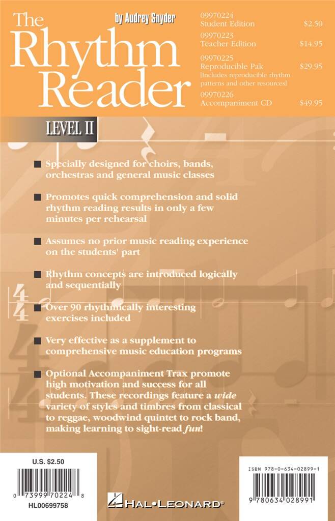 Voici une suite à la méthode populaire de lecture rythmique d’Audrey Snyder. Conçu pour les chorales, les fanfares, les orchestres et les cours de musique en général, « The Rhythm Reader II » favorise une compréhension rapide avec une lecture rythmique solide, ne nécessitant que quelques minutes d’utilisation à chaque répétition. Le Volume II poursuit le programme séquentiel en offrant des instructions et des pratiques en égalités, rythmes pointés, temps coupé et autres mesures, combinaisons de croches, mesures composées, triolets et plus encore. Les concepts sont introduits de manière logique et séquentielle au cours de plus de 100 exercices. Les accompagnements enregistrés optionnels sur le CD favorisent une grande motivation et réussite pour tous les élèves. Ces enregistrements présentent une grande variété de styles et de timbres, du classique au reggae, du quatuor à cordes au rock, rendant l’apprentissage de la lecture à vue AMUSANT !