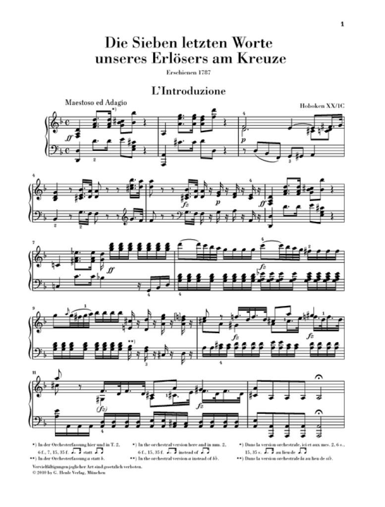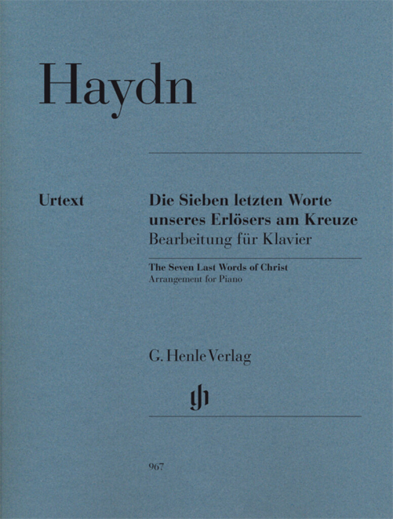 En 1786, sur commande du chanoine de la cathédrale de Cadix, Haydn compose des musiques méditatives à jouer en alternance, le Vendredi saint, avec la lecture des dernières paroles du Christ. Cette version orchestrale ainsi qu'une adaption pour quatuor à cordes (HN 851 et HN 9771) paraissent dès le printemps 1787 chez l'éditeur viennois Artaria. A peine dix ans plus tard, Haydn compose en outre une version oratorio, disponible chez Henle dans la série «Studien-Edition» (HN 9830). Haydn ne réalise certes pas lui-même la version pour «Clavicembalo o Forte Piano», mais, ayant pris connaissance des épreuves, il la loue disant qu'elle est «trés bonnes et écrite avec un zèleparticulier». D’ailleurs cette oeuvre des plus expressives convient aussi remarquablement pour une exécution sur orgue. ?