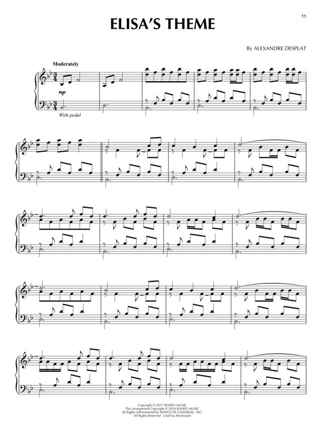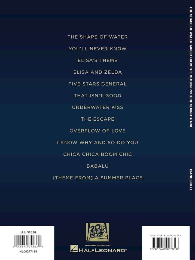 13 selections from Alexandre Desplat 's Academy Award-winning original score to this critically acclaimed, award-winning 2017 film, arranged for piano solo: Babalu • Chica Chica Boom Chic • Elisa and Zelda • Elisa's Theme • The Escape • Five Stars General • I Know Why (And So Do You) • Overflow of Love • The Shape of Water • (Theme From) a Summer Place • That Isn't Good • Underwater Kiss • You'll Never Know.