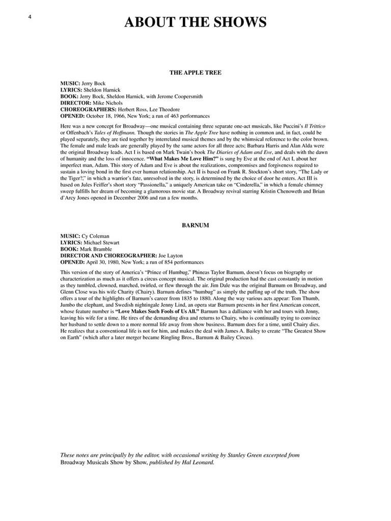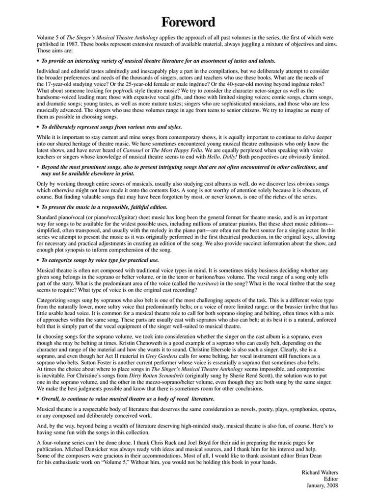 Encore de superbes chansons pour les chanteurs de théâtre de toutes sortes, allant de sélections contemporaines issues de spectacles récents (The Drowsy Chaperone, Curtains, Grey Gardens, Hairspray, Jersey Boys, The Light in the Piazza, Spamalot, Spring Awakening, Wicked), ainsi qu’un regard plus approfondi sur les comédies musicales classiques. Comme dans tous les volumes précédents de la série, toutes les chansons sont en versions authentiques dans les tonalités originales, avec des notes sur chaque émission et chaque chanson. Disponible avec des CD d’accompagnement (2 CD par coffret). 40 chansons par volume. HL00001151 Livre HL00001162 Livre/CDs HL00001157 CD d’accompagnement