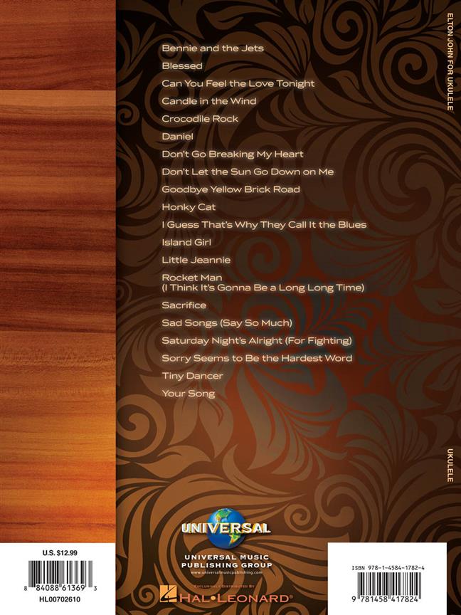 Ce songbook contient 20 Elton John favoris de ukulélé avec une ligne mélodique, les paroles et les accords de ukulélé. Les chansons incluent: Bennie and the Jets - Can You Feel the Love Tonight - Candle in the Wind - Crocodile Rock - Daniel - Don't Go Breaking My Heart - Goodbye Yellow Brick Road - I Guess That's Why They Call It the Blues - Rocket Man (I Think It's Gonna Be a Long Long Time) - Sad Songs (Say So Much) - Saturday Night's Alright (For Fighting) - Your Song