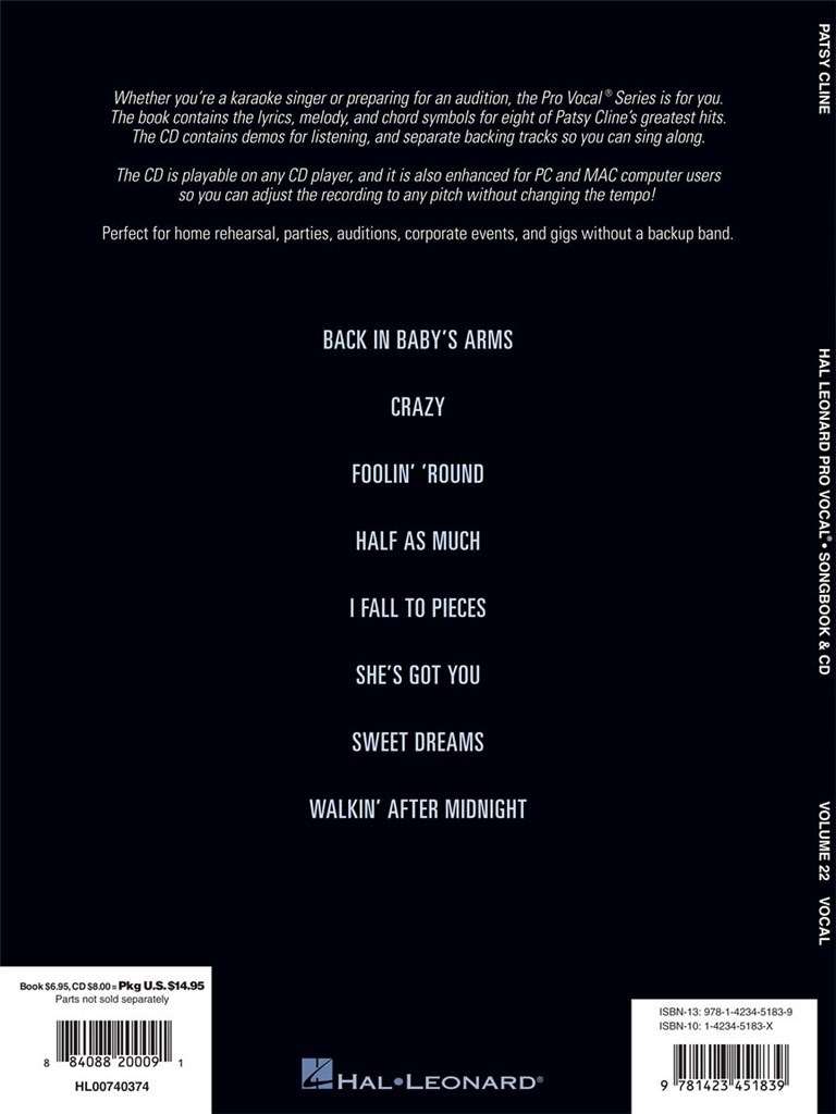 Que vous soyez chanteur de karaoké ou que vous prépariez une audition, la série Pro Vocal est faite pour vous. Le livre contient les paroles, la mélodie et les symboles d’accords de huit chansons classiques. Le CD contient des démos pour écouter et des pistes d’accompagnement séparées pour que vous puissiez chanter en même temps. Le CD est lisible sur n’importe quel CD, mais il est aussi amélioré pour les utilisateurs PC et Mac, ce qui permet d’ajuster l’enregistrement à n’importe quelle hauteur sans changer le tempo ! Parfait pour les répétitions à la maison, les fêtes, les auditions, les événements d’entreprise et les concerts sans groupe d’accompagnement. Ce volume comprend certains des plus grands succès de Patsy Cline, dont Back in Baby’s Arms, Crazy, Foolin' 'Round, Half as Much, I Fall to Pieces, She’s Got You, Sweet Dreams et Walkin' After Midnight.