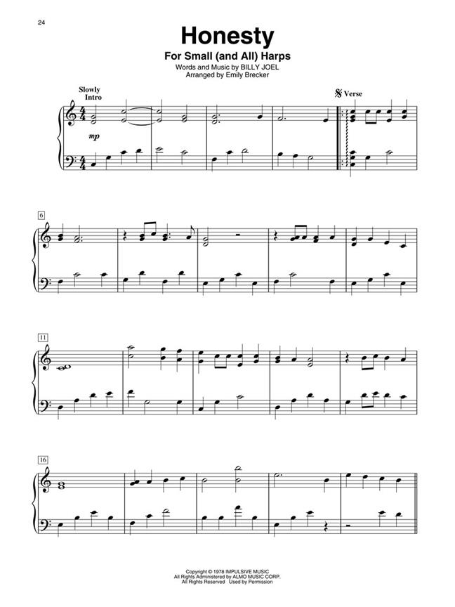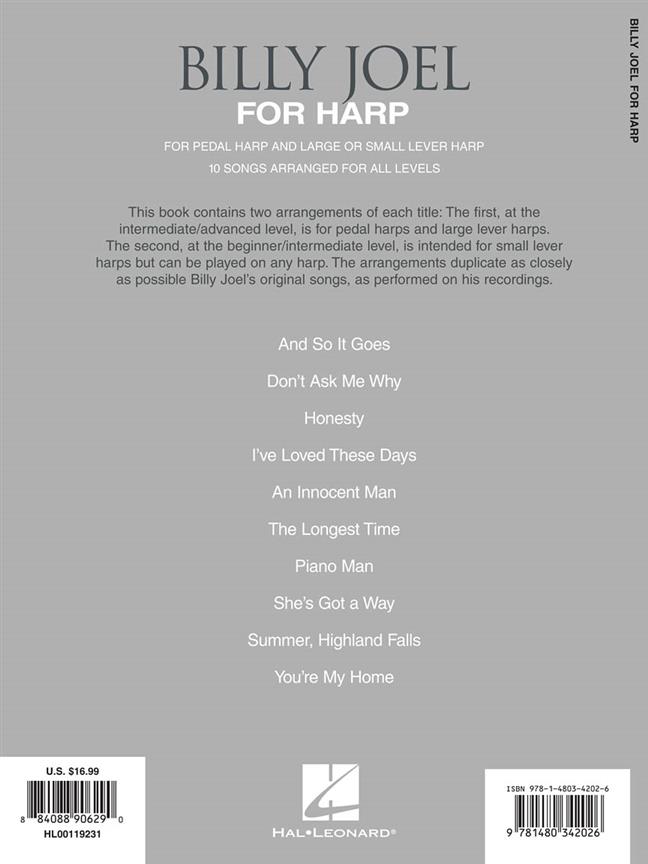 Billy Joel : For Harp présente chaque titre en deux arrangements - d’abord au niveau intermédiaire/avancé pour les harpes à pédales et les harpes à gros leviers - la seconde pour le niveau débutant/intermédiaire, destinée aux harpes à petits leviers.