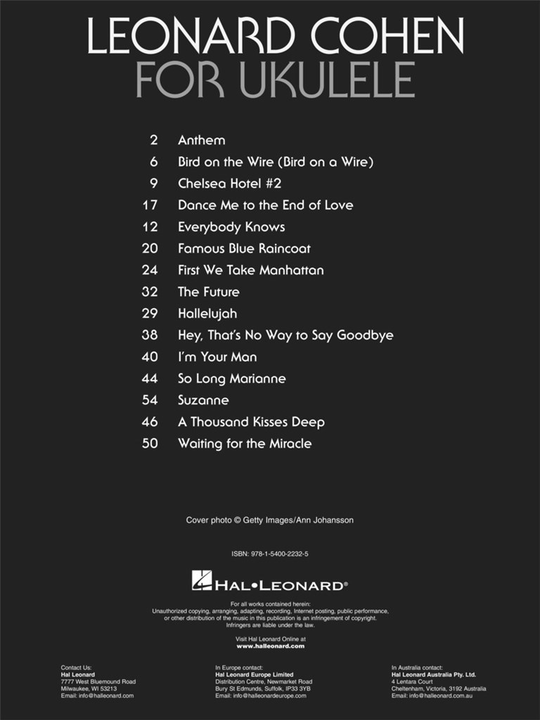 Une sélection de 15 titres pour jouer et chanter dans les tonalités classiques G-C-E-A, incluant : Bird on the Wire (Bird on a Wire) - Chelsea Hotel #2 - Dance Me to the End of Love - Everybody Knows - First We Take Manhattan - Hallelujah - I'm Your Man - So Long Marianne - Suzanne - et bien d'autres encore.