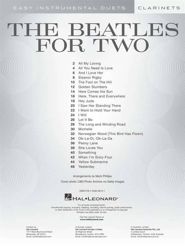 Cette collection contient 23 morceaux favoris, arrangés pour duos faciles et extraits de Fab Four : All You Need Is Love, Eleanor Rigby, Here Comes the Sun, Hey Jude, I Want to Hold Your Hand, Penny Lane, Something, Yellow Submarine, Yesterday, et bien d'autres encore.