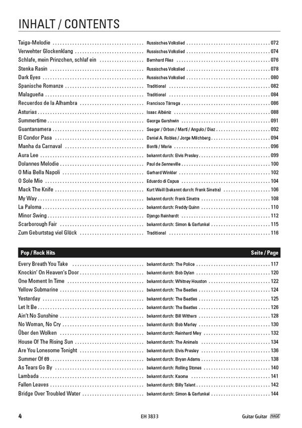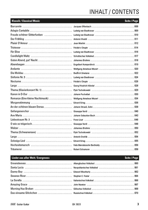 So eine Auswahl gab es für die akustische Gitarre noch nie: Diese Sammlung der 100 schönsten und beliebtesten Melodien aus Klassik, Liedern aus aller Welt, Evergreens, Pop-/Rock-Hits und Filmmusik ist absolut einmalig. Sie enthält wundervolleklassische Werke von mozart, Beethoven, Bach uvm. , weltbekannte Lieder von z. B. Django Reinhardt, Francisco Tárrega, Isaac Albéniz, tolle Pop- und Rock-Klassiker von Eric Clapton, Santana oder den Beatles und legendäre Film- und Musical-Hits aus DerPate, Evita oder Gladiator. Die Autoren Klaus Jäckle und Krzysztof Borkowski verstehen es meisterhaft, weltbekannte Melodien originalgetreu, einfach spielbar und trotzdem abwechslungsreich für die Gitarre zu arrangieren. Die leichten bis mittelschweren Stücke sind sowohl fürdas Selbststudium als auch für den klassischen Gitarrenunterricht bestens geeignet. Aufgrund ihrer Qualität und des Umfangs bietet die Auswahl Fingerpicking-Spielern und klassischen Gitarristen gleichermaßen vielSpielspaß. Im Gitarrenunterricht bietet Guitar Guitar eine willkommene abwechslung und zusätzliche Motivation, denn viele Stücke sind bekannt und beliebt, jedoch selten in der herkömmlichenGitarrenliteratur zu finden. Geübte Spieler finden in Guitar Guitar eine Fülle an tollen Spielstücken für jede Gelegenheit. Damit gehört das Buch in die Notenbibliothek jedes Gitarristen und ist so einjahrelanger Begleiter. Neben der klassischen Notation sind die Stücke auch in Tabulaturschreibweise angegeben.
