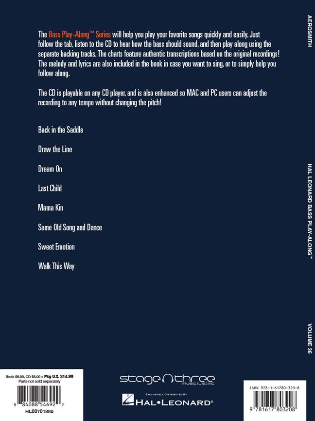 La Basse Play-Along série vous aidera à jouer vos chansons préférées rapidement et facilement! Il suffit de suivre l'onglet, écouter le CD pour entendre comment la basse doit sonner, puis jouer en utilisant la piste d'accompagnement séparée. La mélodie et les paroles sont incluses dans le livre au cas où vous voulez chanter, ou tout simplement pour vous aider à suivre. Le CD audio est jouable sur n'importe quel lecteur CD, et a également amélioré afin que les utilisateurs PC et Mac peuvent ajuster l'enregistrement à n'importe quel tempo sans changer la hauteur! Chansons: Back in the Saddle - Draw the Line - - Dream On Last Child - Mama Kin - Same Old Song and Dance - Sweet Emotion - Walk This Way.