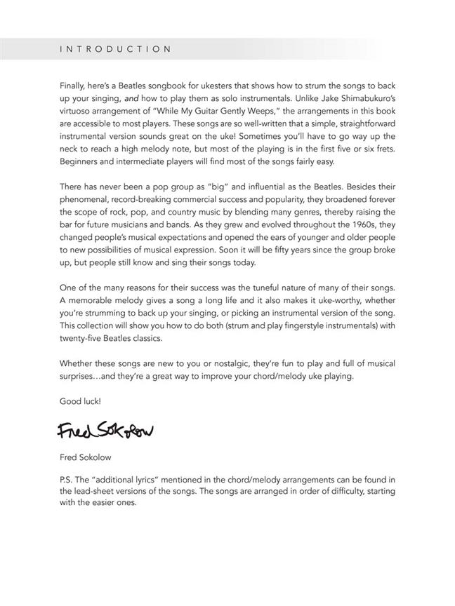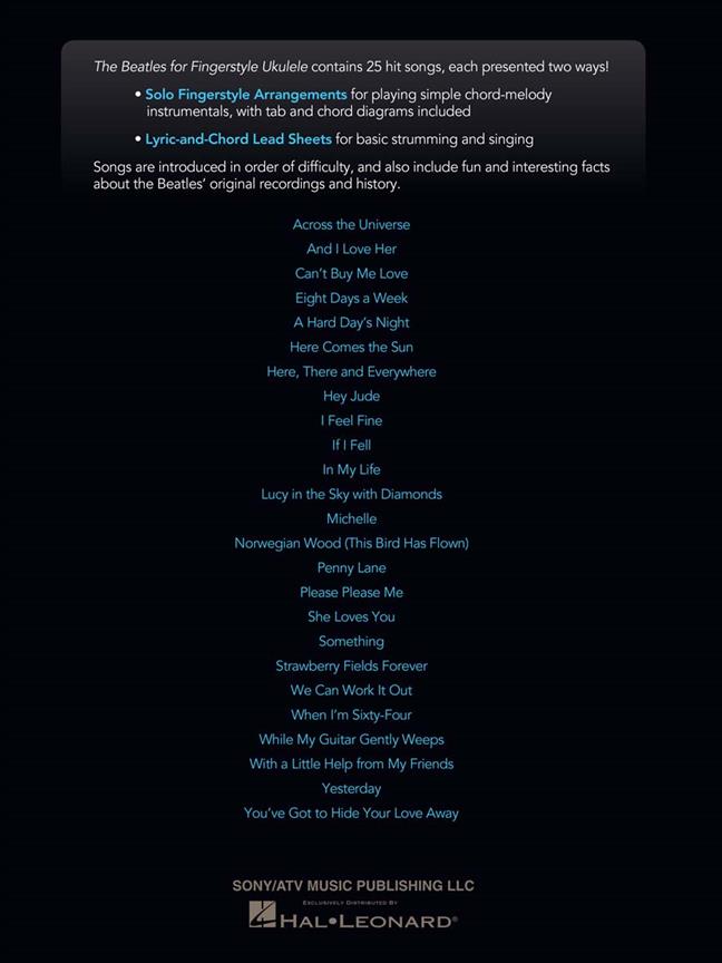The Beatles For Fingerstyle Ukulele contains 25 favorite songs, each presented two ways: first as solo fingerstyle arrangements for playing simple chord-melody instrumentals with tab and chord diagrams included and also as lyric-and-chord lead sheets for basic strumming and singing.