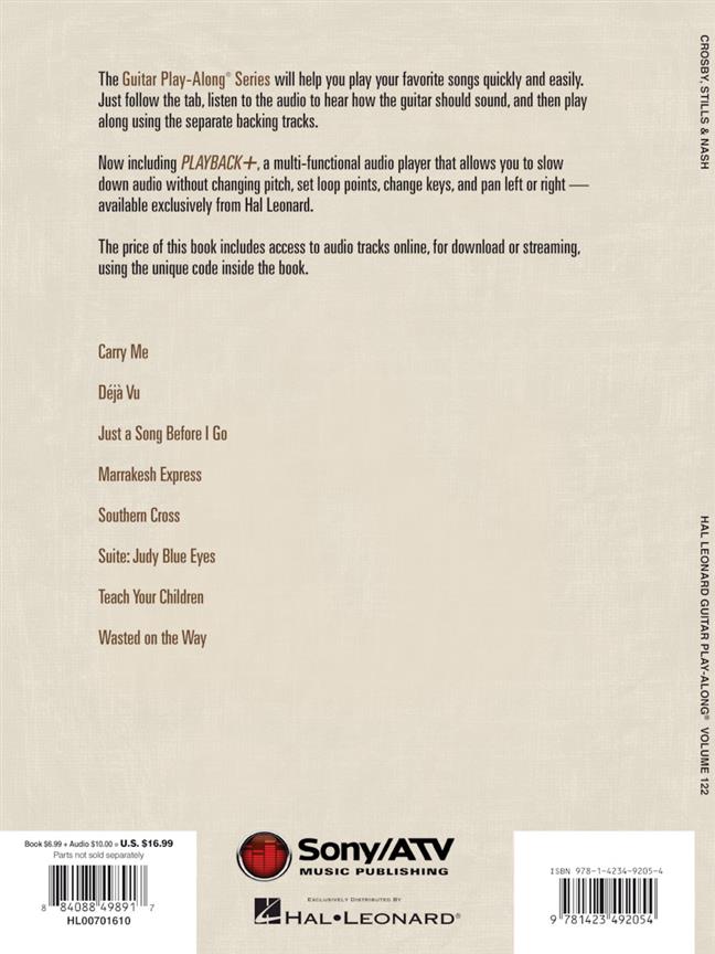 La série Guitar Play-Along vous aidera à jouer vos chansons préférées rapidement et facilement ! Il suffit de suivre l’onglet, d’écouter le CD pour entendre comment la guitare doit sonner, puis de jouer en même temps avec les pistes d’accompagnement séparées. La mélodie et les paroles sont également incluses dans le livre si vous souhaitez chanter, ou simplement pour vous aider à suivre. Le CD audio est lisible sur n’importe quel lecteur CD, et est également amélioré pour que les utilisateurs PC et Mac puissent ajuster l’enregistrement à n’importe quel tempo sans changer de hauteur ! 8 chansons : Carry Me · Déjà-vu · Juste une chanson avant de partir · Marrakech Express · Croix du Sud · Suite : Judy Blue Eyes · Enseignez à vos enfants · Gaspillé en chemin.