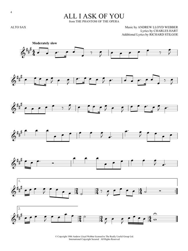 40 of the most memorable songs composed by the inimitable Andrew Lloyd Webber are gathered in this value-packed instrumental solo collection. Songs include: Amigos Para Siempre (Friends for Life) - Any Dream Will Do - Don't Cry for Me Argentina - I Believe My Heart - I Don't Know How to Love Him - Learn to Be Lonely - Love Changes Everything - Memory - No Matter What - The Phantom of the Opera - Pie Jesu - Starlight Express - Stick It to the Man - Tell Me on a Sunday - 'Til I Hear You Sing - Whistle Down the Wind - With One Look - You Must Love Me - and many more.