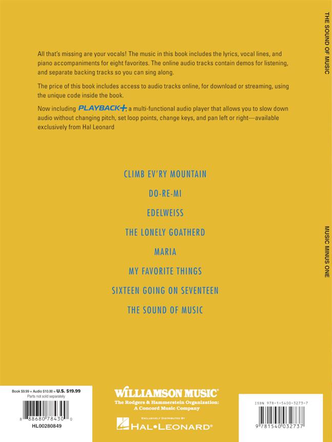 All that's missing are your vocals! The music in this book includes the lyrics, vocal lines, and piano accompaniments for favorites from The Sound of Music. The online audio tracks contain demos for listening, and separate professionally-recorded full-band backing tracks so you can sing along and sound like a pro!