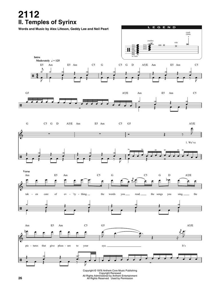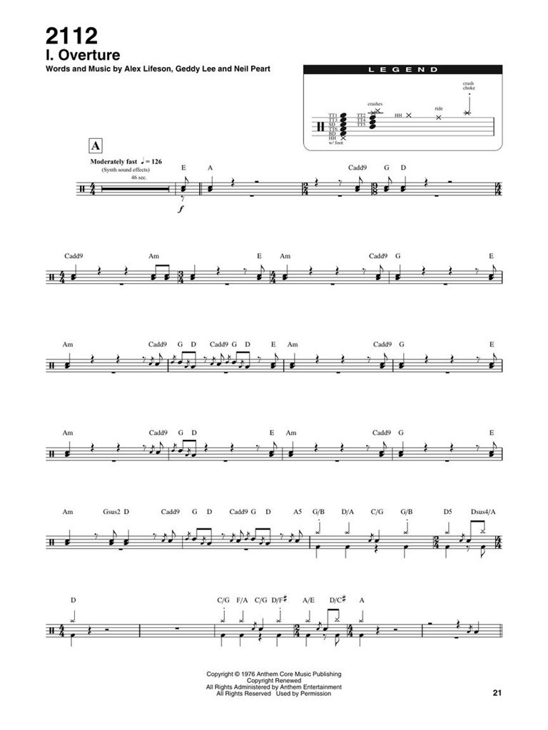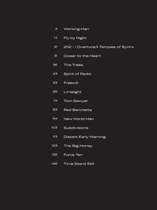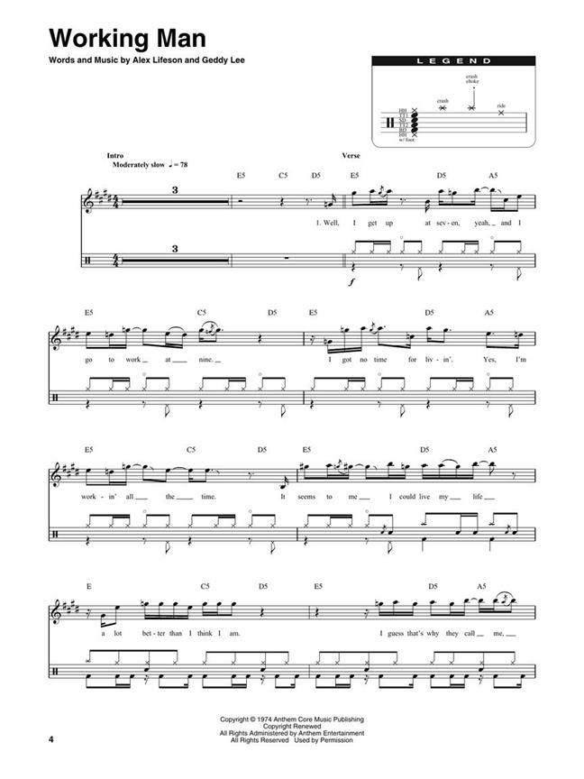 17 exact drum transcriptions of the most popular hits from Neil Peart's playing for Rock & Roll Hall of Famers Rush. Includes: The Big Money · Closer to the Heart · Distant Early Warning · Fly by Night · Force Ten · Freewill · Limelight · New World Man · Red Barchetta · Spirit of Radio · Subdivisions · Time Stand Still · Tom Sawyer · The Trees · Working Man · 2112 (I Overture & II Temples of Syrinx).