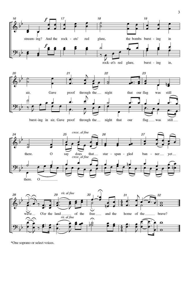 2014 marque le 200e anniversaire de l’écriture de la pièce de Francis Scott Key qui est devenue notre hymne national. Tim Sharp, directeur exécutif de l’ACDA, a vu une opportunité pour les chorales de toute l’Amérique de se rassembler en harmonie et en célébration. Son arrangement est basé sur l’improvisation réalisée par Rachmaninov, citoyen américain, et peut être chanté a cappella ou accompagné (voir NMK1001/HL00125145) par National Music Publishers.
