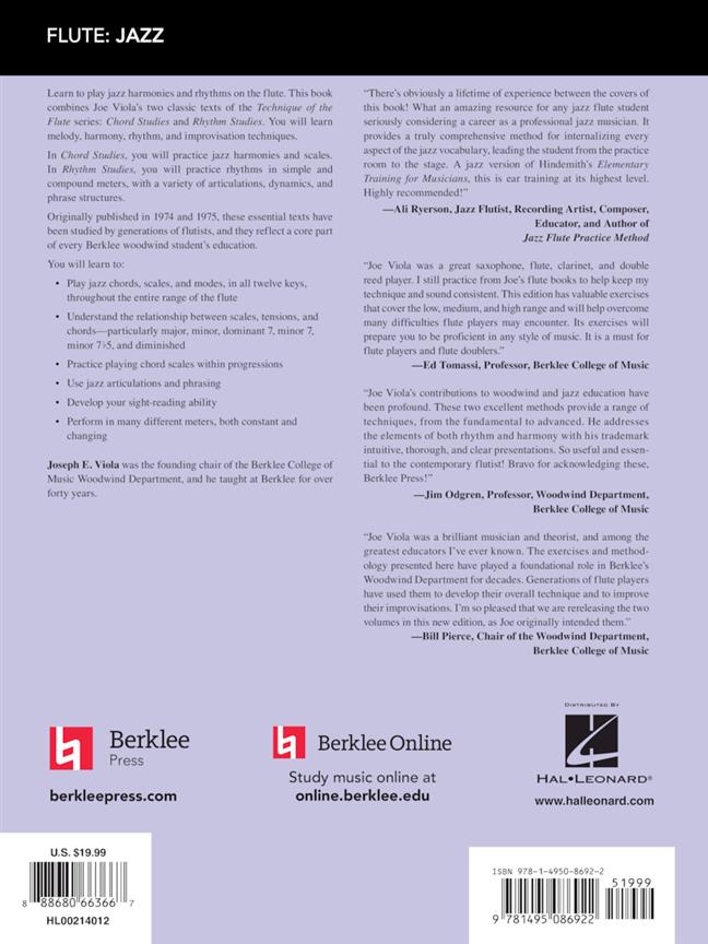 Learn to play jazz harmonies and rhythms on the flute. This book combines Joe Viola's two classic texts of the Technique of the Flute series: Chord Studies and Rhythm Studies. You will learn melody, harmony, rhythm and improvisation techniques. In Chord Studies you will practice jazz harmonies and scales. In Rhythm Studies you will practice rhythms in simple and compound meters, with a variety of articulations, dynamics and phrase structures. Learn to play jazz harmonies and rhythms on the Flute. This book combines Joe Viola 's two classic texts of the Technique of the Flute series: "Chord Studies” and "Rhythm Studies.” You will learn melody, harmony, rhythm and improvisation techniques. In "Chord Studies” you will practice jazz harmonies and scales. In "Rhythm Studies” you will practice rhythms in simple and compound meters, with a variety of articulations, dynamics and phrase structures.
