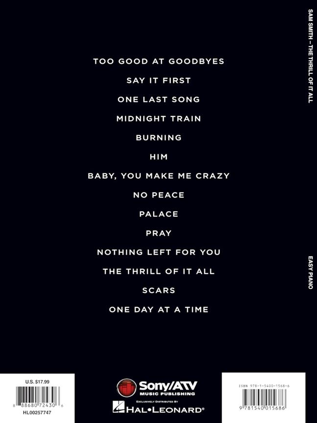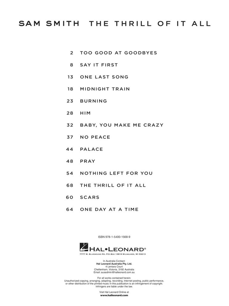 Smith's sophomore album release in 2017 topped the Billboard" 200 album charts. This matching folio features 14 songs: Baby, You Make Me Crazy - Burning - Him - Midnight Train - No Peace - Nothing Left for You - One Day at a Time - One Last Song - Palace - Pray - Say It First - Scars - The Thrill of It All - Too Good at Goodbyes.