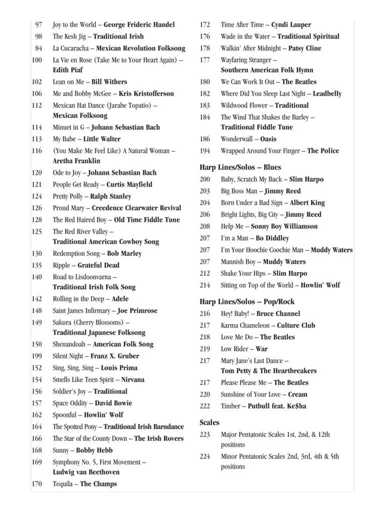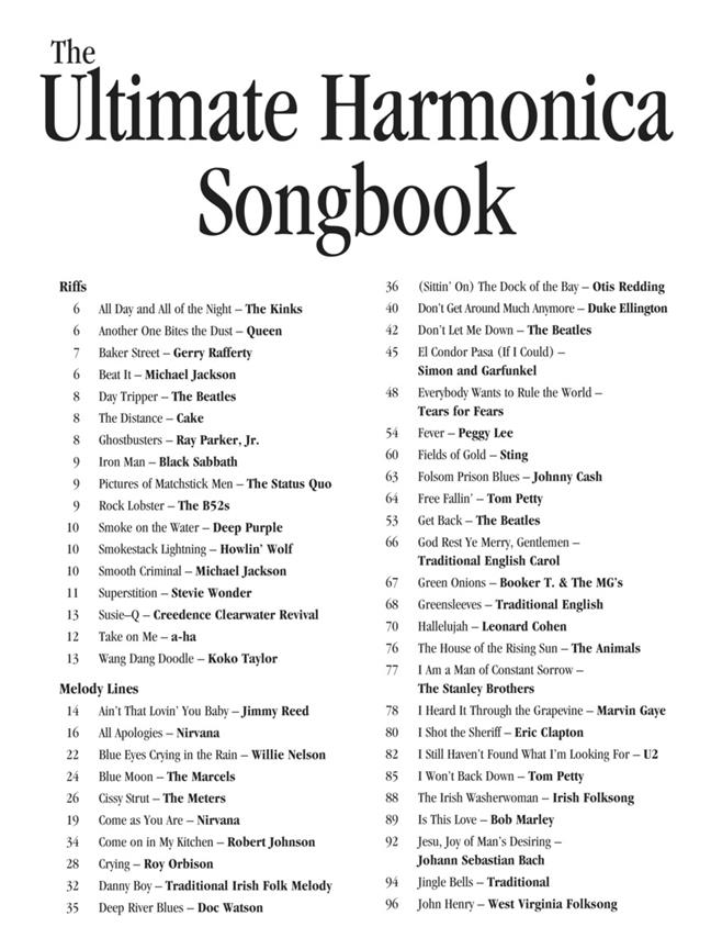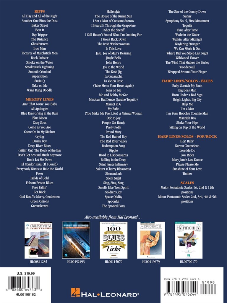 Si vous partez sur cette île déserte avec votre harmonica, c’est le seul recueil de chansons que vous aurez besoin d’emporter ! Il comprend 114 chansons issues de divers genres, présentées sous différents formats. Présenté en riffs : Another OneBites the Dust · Beat It · La Distance · Iron Man · Fumée sur l’eau · Superstition · et plus encore. Présenté en lignes mélodiques : Pleurant · Tout le monde veut dominer le monde · Fièvre · Blues de la prison de Folsom · Chute libre · Oignons verts · Alléluia · Je suis un homme de douleur constante · J’ai tiré sur le shérif · La Cucaracha · Appuiez-vous sur moi · Moi et Bobby McGee · Ode à la joie · Proud Mary · Ça sent l’Esprit Adolescent · Tequila · Wonderwall · et plus encore. Présenté en lignes de harpe avec solos : Born Under a Bad Sign · Je suis ton homme Hoochie Coochie · Karma Caméléon · Low Rider · La dernière danse de Mary Jane · Le rayon de soleil de ton amour · et plus encore. Des gammes pentatoniques majeures en 1re, 2e et 12e positions ainsi que des gammes pentatoniques mineures en 2e, 3e, 4e et 5e positions sont également présentées.