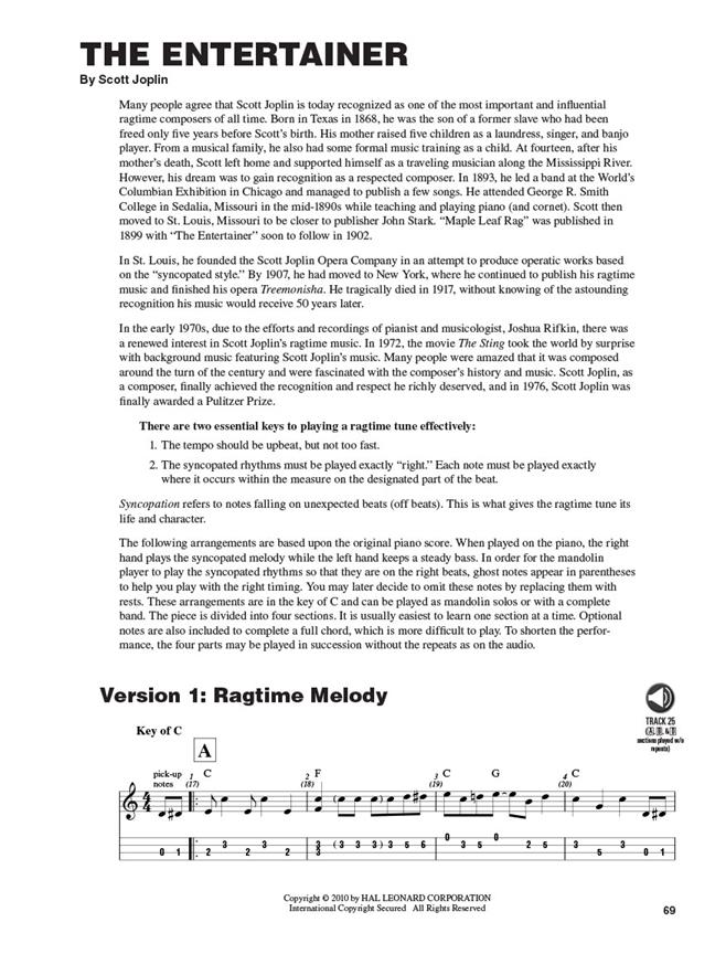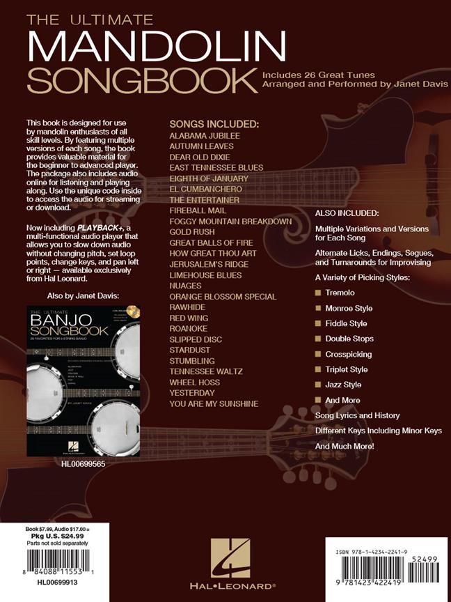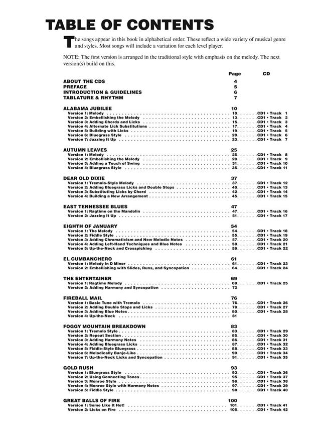 Le Songbook Mandoline Ultime contient plusieurs versions qui varient en difficulté de 26 des chansons les plus populaires de bluegrass, jazz, ragtime, rock, pop, gospel, le swing et d'autres genres, à la fois dans la notation standard et tablature mandoline.
