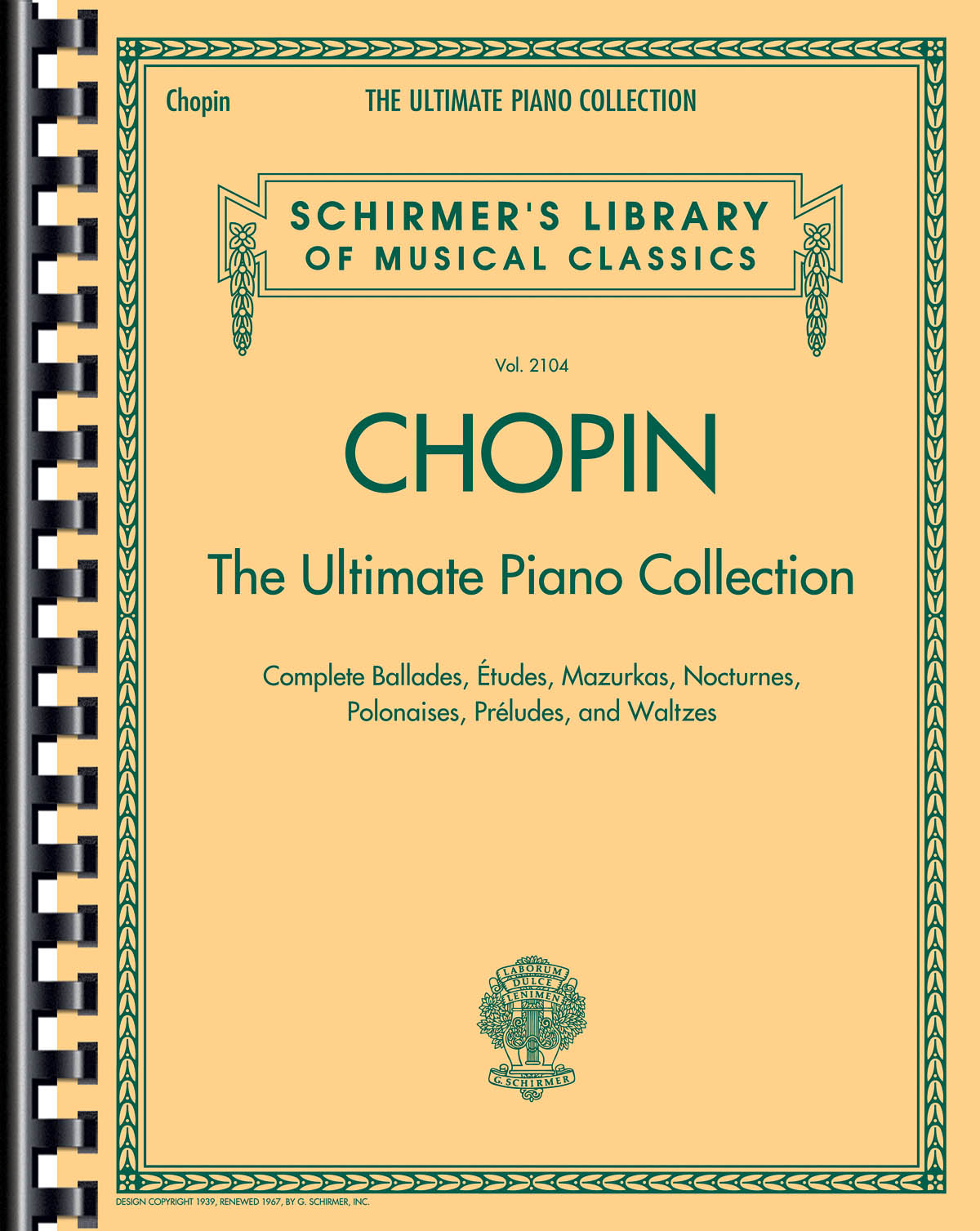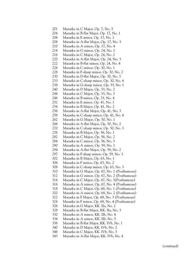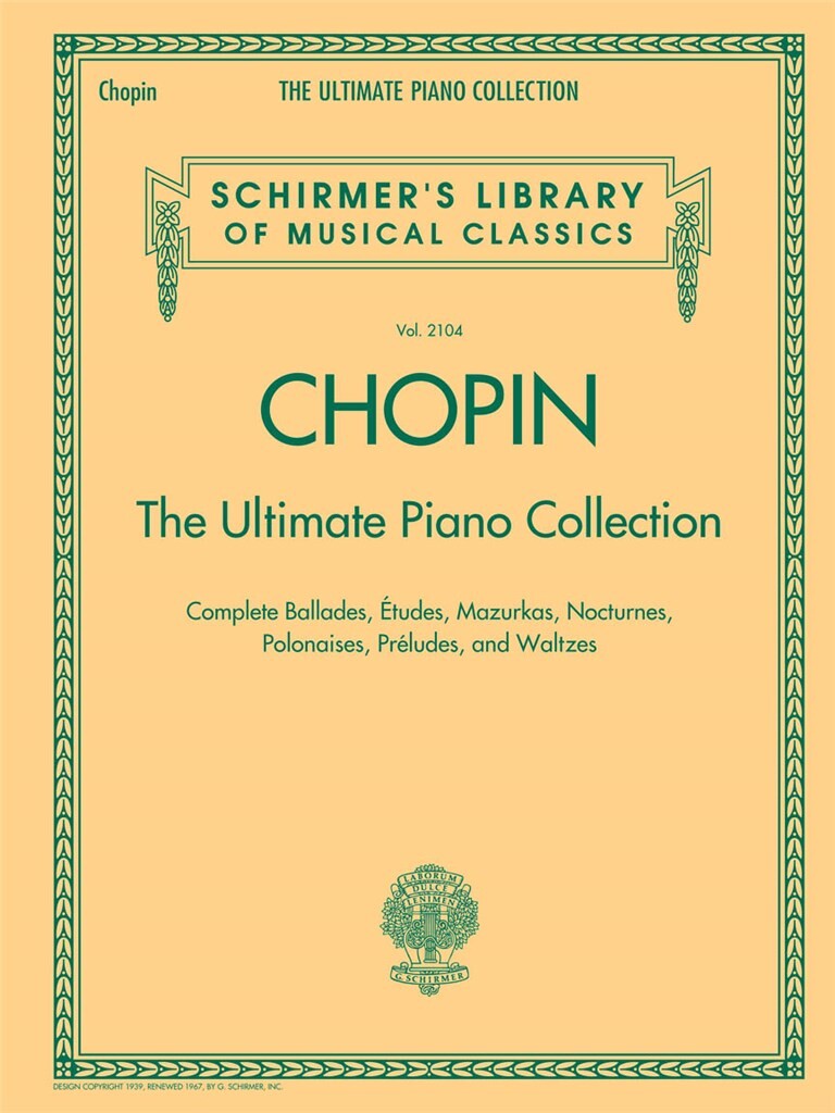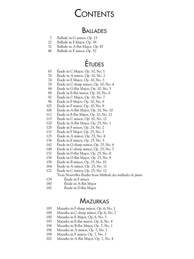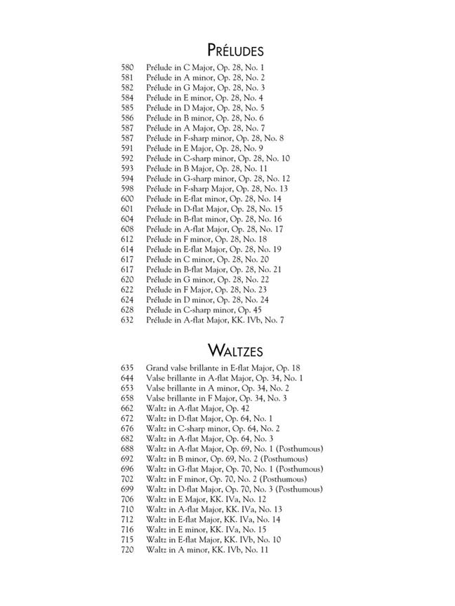 Ce gigantesque volume de 724 pages comprend pratiquement l’intégralité des œuvres de Chopin. Le livre est relié en peigne pour faciliter l’utilisation. Une grande valeur pour l’intégralité des Balades, Études, Mazurkas, Nocturnes, Polonaises, Préludes et Valses.